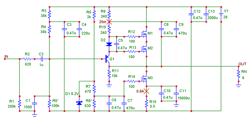 Резисторы со звездочкой R5 - симметрия по ограничению, R8 - ток покоя (порядка 800 мА).
