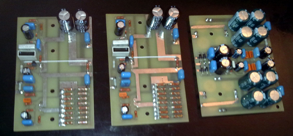 Фото плат блока питания (в нем еще +\- 18 В для питания предв. усилителя) и повторителей (без выходных транзисторов и разделительной емкости С11) привожу ниже.