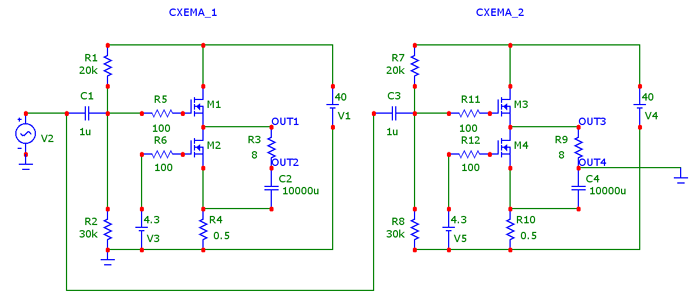 2. Следящее питание (М1) для самого "нежного" транзистора (М2) - соответственно, малая девиация мощности на нем и низкие тепловые искажения, как следствие.