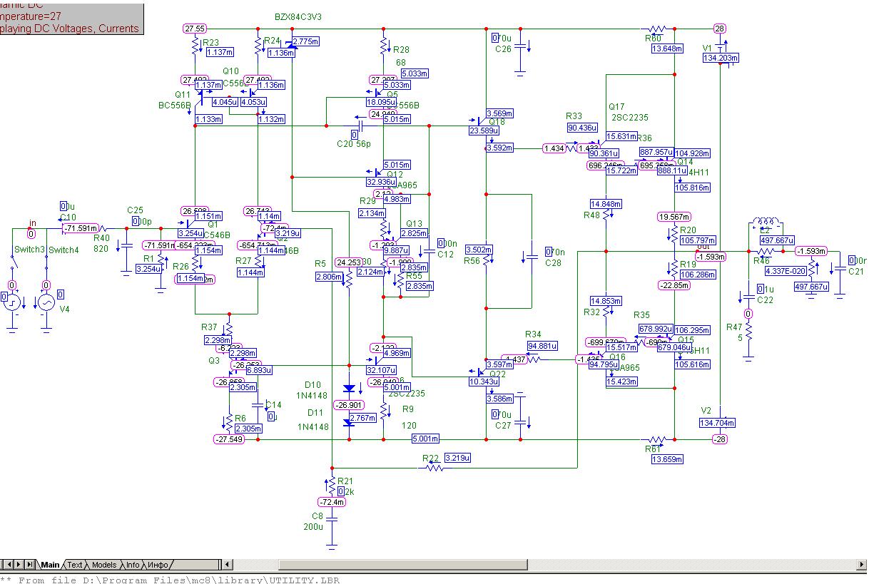 Увидел в сией схеме ещё один "ляп" - для правильной работы схемы стабилизации тока покоя на Q13 ток через R29, R30 должен быть равен 1/10 тока этого каскада, то есть сумма этих сопротивлений должна быть 14 - 15кОм, а R55 не нужен, его следует исключить. Вячеслав.