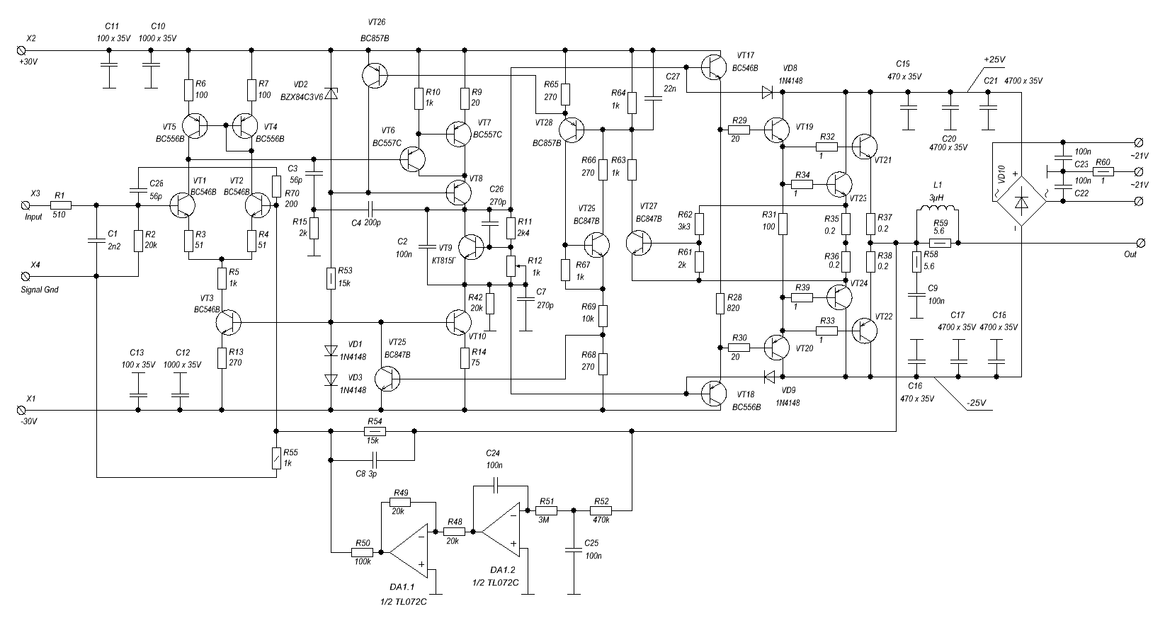 В общем ситуация такая. Начитавшись Дугласа нашего Селфа и прочих умных книжек, и имея свободное время на новогодние праздники решил от нечего делать спаять на макетке банальную по сути схему, представленную ниже. Спаял вполне удачно . Удачно в том плане, что ошибок монтажа не нашлось и первое включение на страх и риск без всяких предохранителей прошло удачно. Постоянка на выходе сразу встала 27мВ. А вот дальше и началось веселье, чем далее тем более любопытственное. При попытке выставить ток покоя проявились явные признаки возбуда, вроде бы погашенные увеличением емкости коррекции (С19). Вроде бы, потому что загадочное плавание тока покоя туда-сюда навело на мысли, что оно именно вроде бы. Подключил осциллограф на выход и явственно узрел генерацию на примерно 5Мгц с амплитудой в 60мВ. Ну есть и есть, припаял в параллель С19 ещё 40 пФ - ноль реакции, т.е. и частота и амплитуда не поменялись. Припаял 200 пФ - амплитуда выросла, частота осталась (почесал репу). Вернул назад к 80 пФ. Увеличил резисторы в эмиттерах дифкаскада поэтапно 56-300-820 Ом. Ноль реакции. Даже частота не меняется! Пробовал ставить емкость КЭ в первую и вторую пару тройки. В результате только синусоида с выхода ушла и появился шумоподобный след генерации. Увеличивал резисторы в базах оконечников - эффект как от емкости КЭ. Плюнул в итоге, вернул всё назад и решил уменьшать глубину ООС. Довел усиление до 600. Ноль эмоций, генерит на всё тех же 5МГц. И амплитуда, что характерно, та же. Отпаял выходники - тишина. Вернул - генерит. Поставил другие (были тошибы 2SA1941 2SC5198, поставил D44, D45). Частота ушла за пределы возможностей осциллографа (он дохленький, всего 10МГц), а амплитуда подросла в 4 раза. Повторил всё ранее сделанное с новой выходной парой. Результат тот же. Так что пишу сюда, надеясь на коллективный разум.