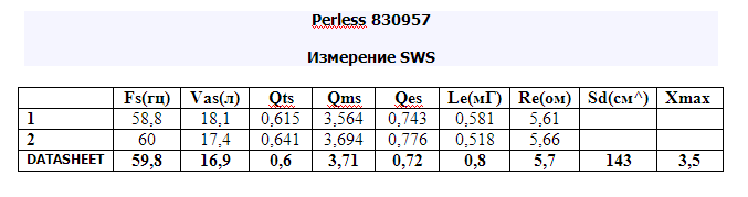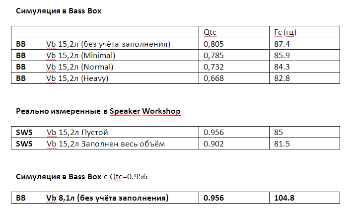 Пробовал подставить получившуюся добротность 0.956 в BassBox. Он выдал нереальные Vb=8.1л и Fsc=104.8гц. (Результаты измерений в таблице)