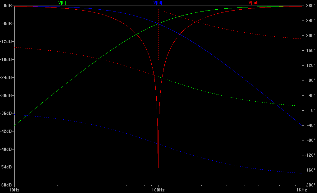 Частоты среза ФНЧ и ФВЧ одинаковые, может надо сделать частоту среза ФВЧ ниже частоты среза ФНЧ, т.е. "сблизить" их ?