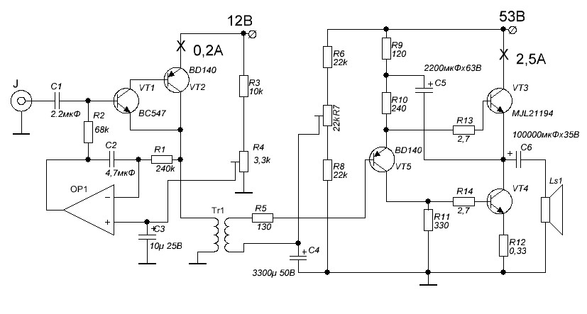 Единственное сомнение - в части термостабилизации режимов выходного каскада, сюда же надо прибавить некорректный режим VT2 с оторванной от земли базой. может оно и работает с оторванной базой, но почему-то никто по серьёзному так не делает. (сплетничают, что транзистор может оказаться в области работы с переворотом фазы базового тока, и говорят что это нехорошо, когда при этом база оторвана от земли ). Впрочем все эти ужасы насчёт переворота фазы базового тока проявляются в режимах с большим напряжением. 53 В для данных транзисторов это большое или небольшое напряжение?