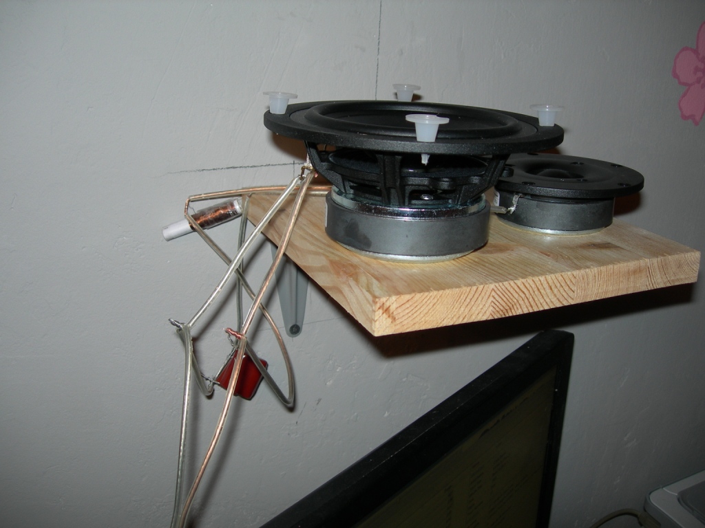 НЧ динамик подключил напрямую, а ВЧ через фильтр второго порядка, ибо мотать катушку из 1,18 кабеля жаба задушила, намотал на глазок катушки из 0,2 кабеля, индуктивность получилась в районе 0,4-0,5, + кондер к73-17 на 6,8+3,3, что соотвествует частоте среза где то 2500гц. Думаю внимательные люди сразу заметят грубейшую ошибку в схеме) а именно кондеры подключены параллельно пустому участку цепи ^_^. Ошибка была исправлена, но все равно ВЧ спокойно играет даже на 500 герцах. Грешу на большое сопротивление катушки. Что посоветуете? все таки намотать из нормального провода или для прогрева сойдет?