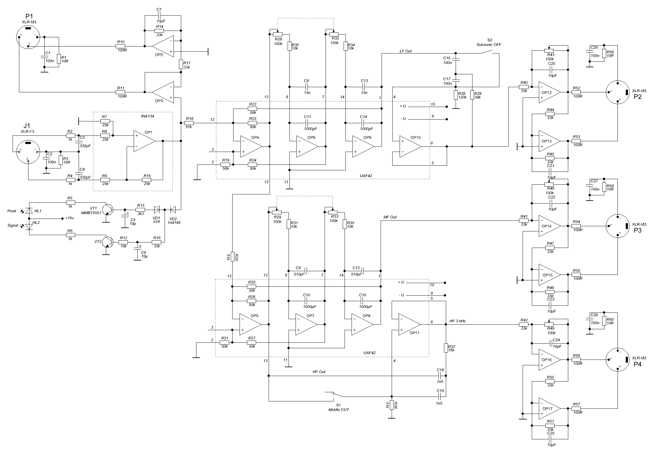 Присутствуют: индикаторы наличия сигнала и пиков, отключаемые сабсоник 23Гц и ФНЧ 2го порядка в ВЧ канале на 3кГц.