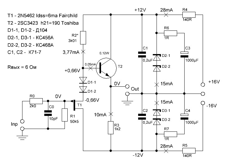 Этот буфер был сделан как входная часть интегрального усилителя. После буфера идет балансный безОООСный усилитель с малым входным сопротивлением, менее 1кОм. От буфера требовалось малое выходное сопротивление (получилось 6 Ом), отсутствие конденсаторов в пути сигнала, хорошая термостабильность нуля на выходе, отсутствие общей ООС. Линейность немного улучшена применением повторительных каскадов с разным типом проводимости (р-канальный jFET и npn биполяр).