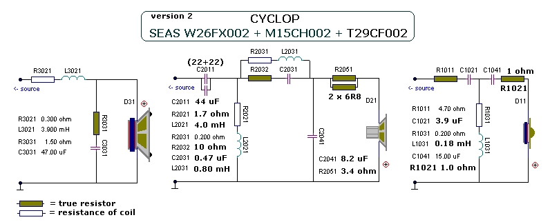 - я бы сказал нормальный столяр! Уже сколько людей обожглись на его проектах, еще одного затягиваете? Вы посмотрите на его фильтры, там черт ногу поломает - куча дорогущих конденсаторов и в результате никудышный звук. И дело там даже не в кривом тональном балансе, я пробовал делать ровную АЧХ и даже задирал ее на ВЧ, звук все равно убивается. Вы посмотрите как он "выравнивает" АЧХ - с помощью последовательного резистора, так помимо этого он его еще ставит перед самим фильтром, а где второй параллельный резистор который будет компенсировать добавочное сопротивление??? Если он такой элементарщины не знает, какой же он тогда акустик? Взглянем на фильтр басовика - 1-й порядок + Цобель, из формулы расчета цепочки Цобеля известно, что R = сопротивлению самого динамика ,т.е. в нашем случае 8 ом, у Троэлса 1,5ом - опять загадки??? У СЧ динамика наверное ровный импеданс, поэтому там Цобель можно не ставить ))). На пищалке давить резонанс ... а зачем??? И опять это уродское уменьшение уровня с помощью параллельных резисторов на СЧ. Что после всего этого получится я уже послушал, вывод один - фильтры на помойку, Троэлса в черный список! Кто не согласен со всем вышеописанным - ткните носом в правильные формулы.