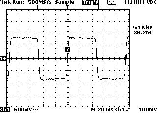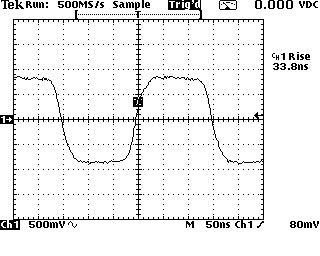 Вот тупо глянул, 3,3МГц меандр с генератора GFG-8217A (аналоговый) печальной формы, но формально фронт 28нс с точки зрения Тек2445.