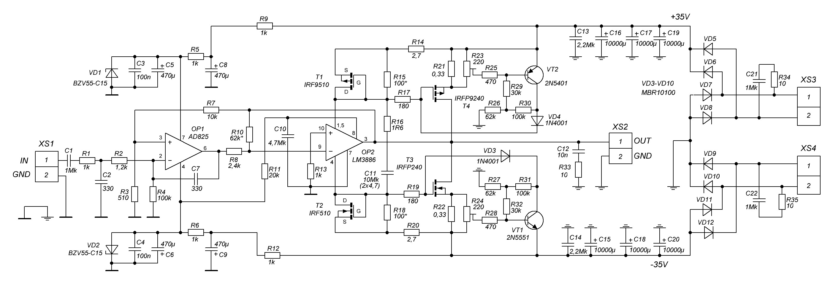 Полевики включены токовым зеркалом с Кт около 8 . С помощью R10 , R8 подстраивается ток покоя .
