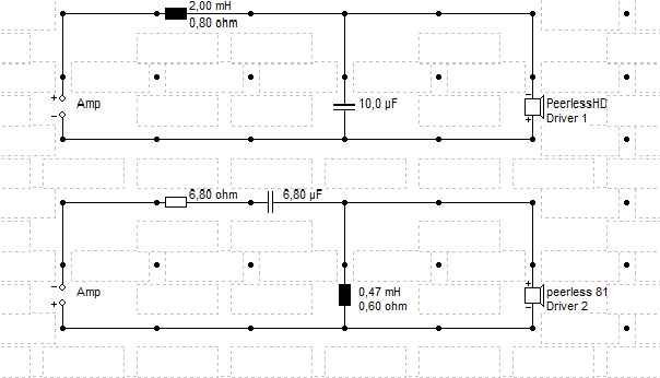 Динамик мидбас peerless HDS Nomex 164 830875. 8Ohm Его фильтр катушка 2мкГ последовательно (придавливал выброс пик на 4кГц) и конденсатор 10мкф параллельно.