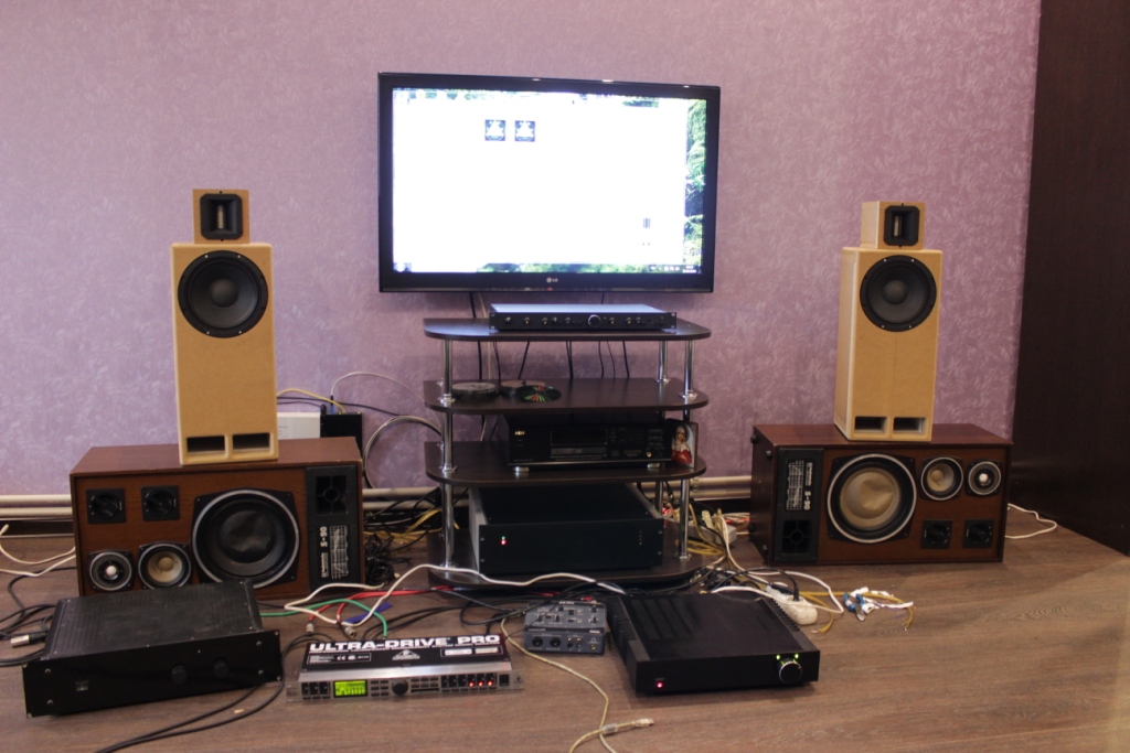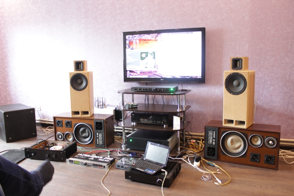 Изначально слушали мои сателлиты подключенные к ВП500 и сабвуфер с моим ВП, делилось все кроссовером Евгения. Источником служил ПК с картой Audiotrak Prodigy HD2