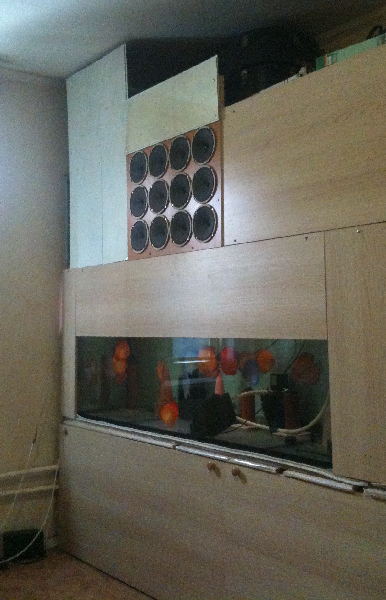 Достал из архивов компа программу Edge и нашел наиболее удачное расположение излучателей. Ниже 1.5 метра от пола попросту никак из-за аквариума.