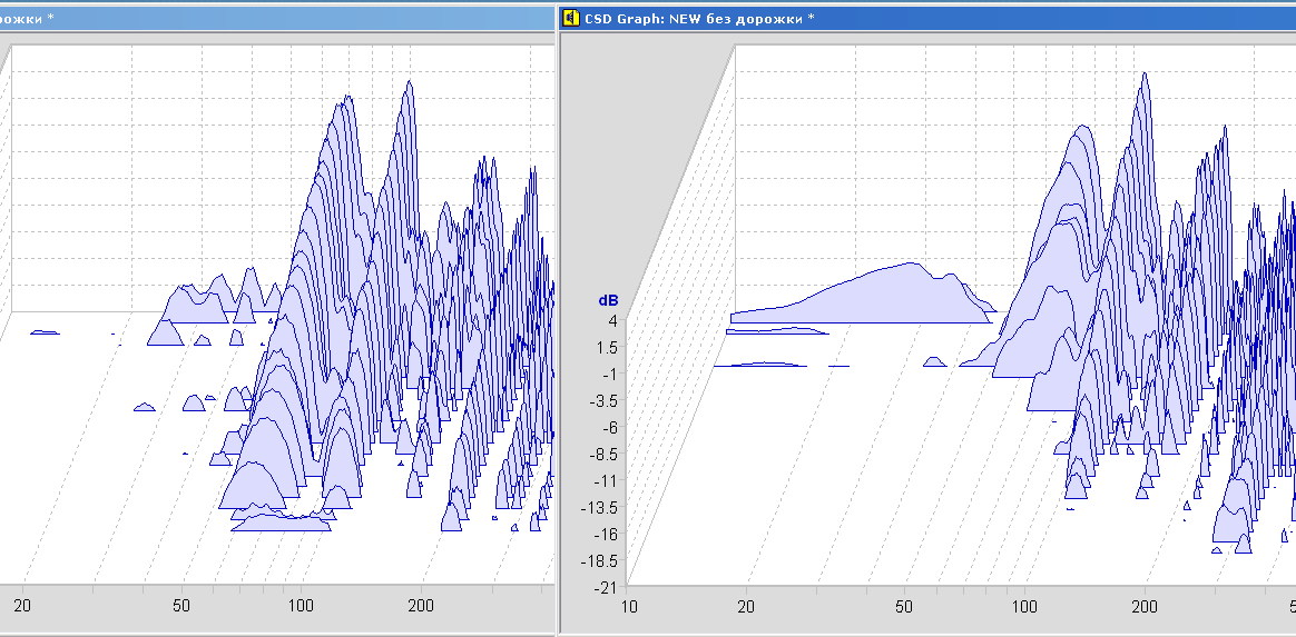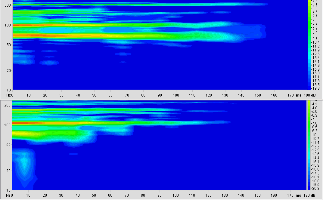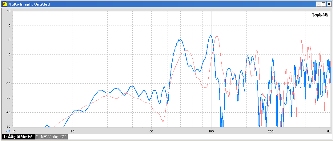 В общем я сделал измерения до ремонта и после ремонта, в почти пустой комнате, где при измерениях были только одна колонка (эффективно воспроизводящая от 30гц), усилитель, и измеряющий - т.е. я. Конечно размеры комнаты немного уменьшились, поэтому частоты резонансов немного увеличились...