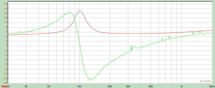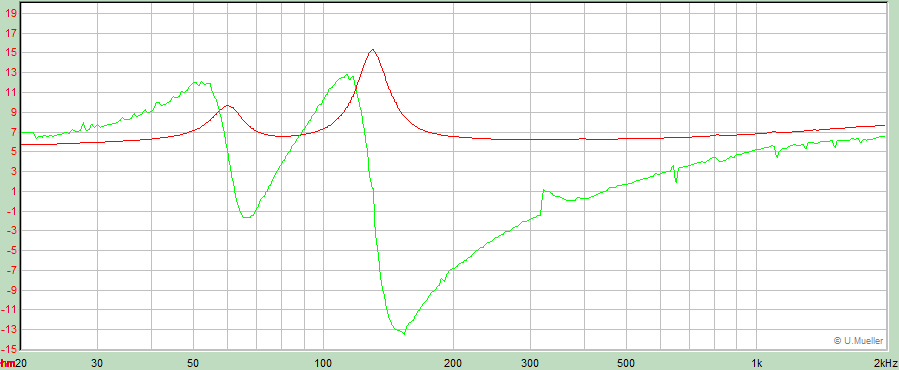 Что мы имеем? Красным цветом - импеданс, зеленым - фаза. На частоте 60Гц, по-видимому пик от фазоинвертора, а на ~130 от динамика и корпуса. Ладно, идем дальше. Достаю динамик из корпуса и меряю его отдельно.