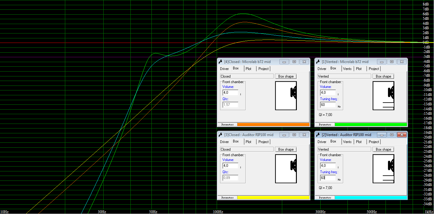 Мда. И главное, размер корпуса почти не влияет на это безобразие. Фазоинвертор тоже только усугубляет картину. Понятно, что дорабатывать корпус тут бесполезно. Разве что глушить горб акустическим режектором. Вспомнил, что у меня где-то валялись разобранные Auditor RIP 100c - автомобильные коаксиалки 10см. Прикинул по размеру - если "ухи" подрезать, то подойдут. Заклеил я им дырки от пищалок плотной бумагой и померил ТС.