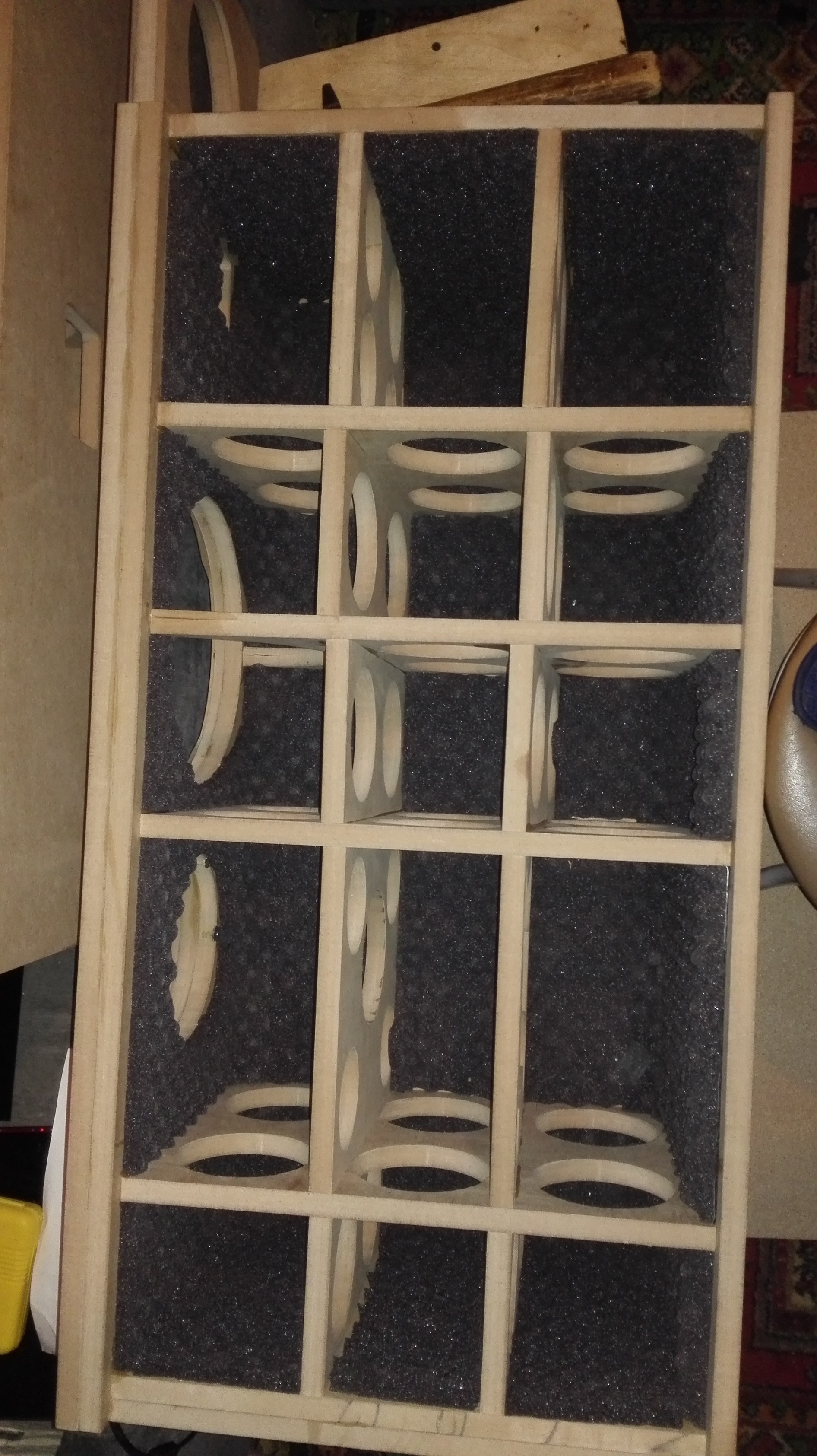 Корпус 16мм мдф, лицевая и дно сдвоенный 32мм(к сожалению в нашем городе толще не найти), недостаточная толщина компенсирована большим количеством распорок, вес колонки с динамиками около 35кг . Объем под нч где то 85л с настройкой 27-30, длин фи будет подгоняться после измерений и фильтра с учетом накачки. В тестовом корпусе на 90 литров скан показал 30гц по -3дб, в беловом варианте было решено слегка занизить объем дабы частично нивелировать накачку и поднять давление на нч. Изначально планировалось активное деление, но в силу некоторых обстоятельств скорее всего буду делать пассив. Разделы планируются 300 и 5-6к, посмотрю на дн ширика и границу акз. Есть надежда что сч-вч сошьются первым порядком, индуктивность сч очень маленькая.