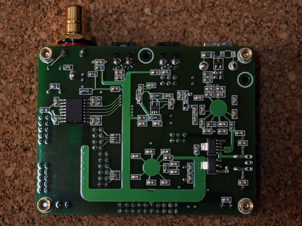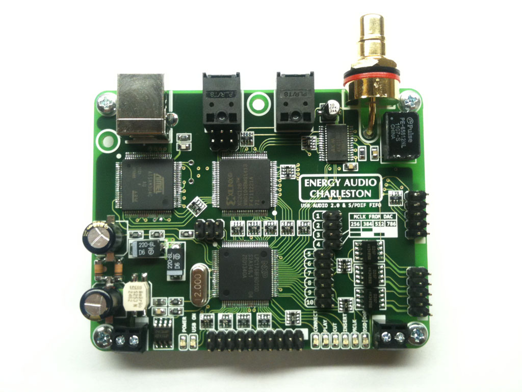 • 1xUSB вход основанный на прошивке AMANERO. Лицензированная прошивка приобретена у представителя amanero.com Domenico Vellante <veldom@amanero.com>. Соответственно использованы драйверы для Windows XP/7/8 — 32-х и 64-х битные версии от того же разработчика. В операционных системах MacOS и Linux устройство работает без драйверов, так как представляет собой устройство стандарта USB Audio Class 2.0 (UAC 2.0). С этого входа Charleston принимает цифровые аудиоданные, записывает их в буфер FIFO (первый пришёл — первый вышел) и выдаёт данные из него на ЦАП по I2S с тактированием от мастерклока этого ЦАПа. Вход синхронный по отношению к источнику - скорость входящего и выходящего потока задаётся генератором мастерклока ЦАПа.
