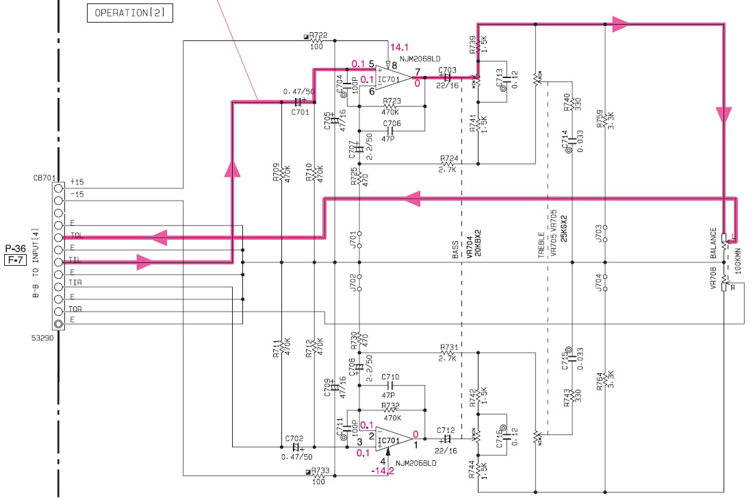 Я не понимаю для чего нужно было делать такой огромный коэффициент усиления ??? на схеме резисторы R723,R725 обратной связи операционного усилителя IC701. получается коэффициент усиления 1000 !!! Вместе с полезным сигналом там же усиливаются и шумы. Поясните пожалуйста для чего такое было наделано и не в этом ли кроется вся пролема темброблока ? Вроде больше ничего криминального в схеме не вижу. Ну разве что электролиты по входу - их номинал какой то странный...![]()