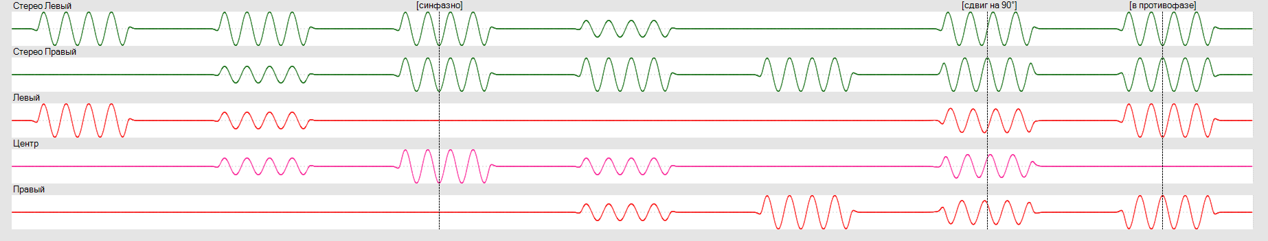 - если сигнал звучал и в левом, и в правом канале в противофазе, он там и останется, а в центральном канале его не будет (так как противофазные сигналы при сложении дают ноль).