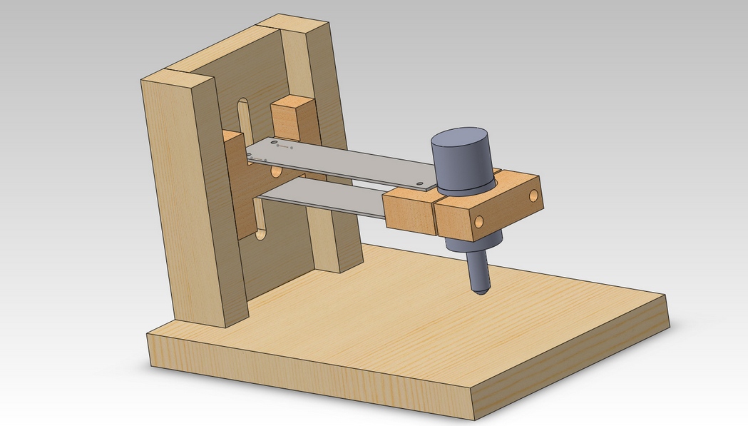 Суть идеи проста - заменяем шарнирные сочленения типового параллелограмма на гибкие пластины. Рабочий ход при этом должен быть небольшим по сравнению с длинной стороной параллелограмма - но для сверлилки ПП большой рабочий ход и не нужен, 5 мм вполне достаточно. Теоретизировать и считать смещение оси сверла я не стал, "интуитивно понятно", что при вылете примерно 100 мм и рабочем ходе 3..5 мм оно (смещение) невелико.