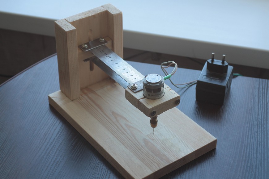 Вот в таком вот "аксепте". Плюсы - простота, легкость изготовления "из ничего", некритичность даже к диким косякам в размерах, к материалам. Минусы - небольшой ход сверла (это скорее неудобство - сверло постоянно висит на небольшой высоте над платой, можно зацепить и сломать), нельзя сверлить толстые детальки.