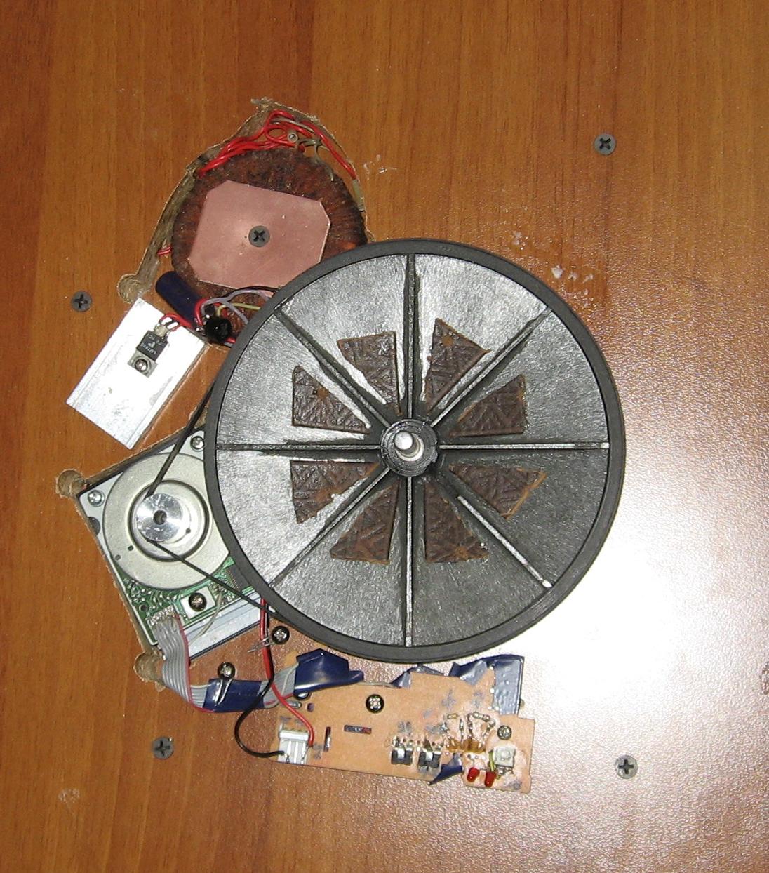 Узел диска. Для начала отбросить мысль о диаметре 150 мм и искать способ сделать или найти нормальный полноразмерный диск. Мотор-тихоход, бесколлекторный (вроде ТСК-1), пассик на шкив под диском, диск-маховик сверху. Черкуновская двойная передача не нужна, достаточно одной ступени, и уж тем более не нужен сетевой мотор. Шаговые двигатели тоже не надо. По крайней мере, могу совершенно точно сказать, что распространенные когда-то движки от привода БМГ старых 5" дисководов непригодны. Они "поют" и песня эта не лечится ни микрошагом (я пробовал от 1/2 до 1/16 с разными аппроксимациями), ни подвеской мотора. Вот такое на фото у меня было когда-то.