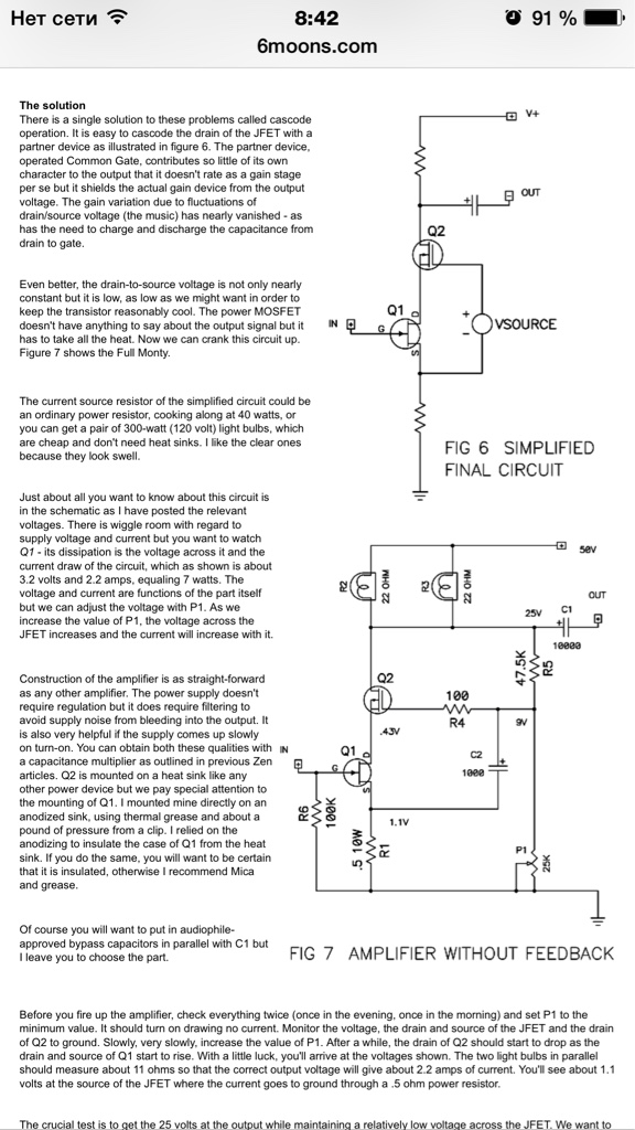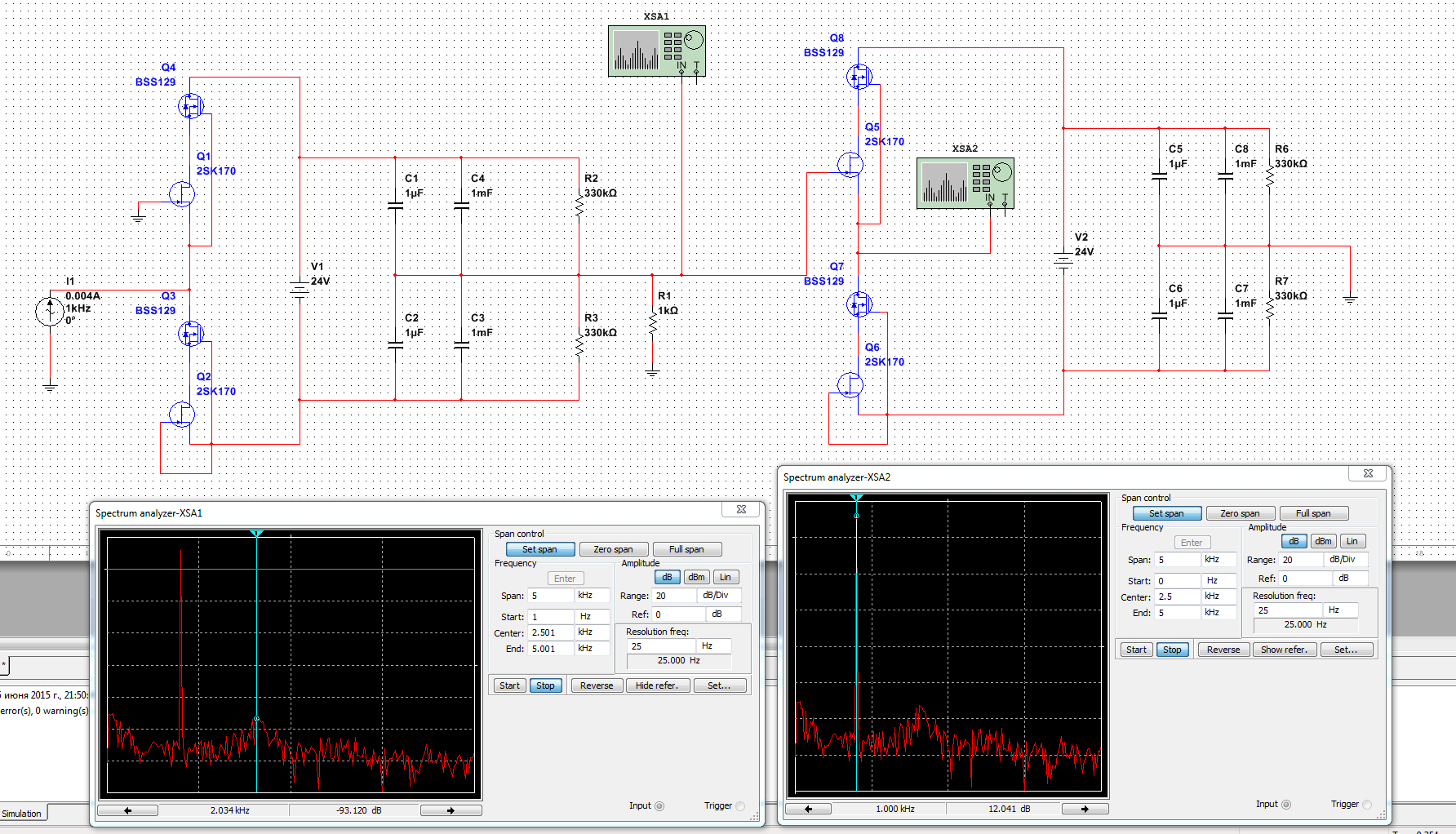 Причем с током покоя и напряжением питания можно вообще не скромничать - 100 мА и 100 Вольт им вполне по силам. КП601 получает свои 1,5 вольта падения на канале, а КП904 честно рассеивает 5 ватт тепла обеспечивая при этом скромный для себя ток в 100 мА.