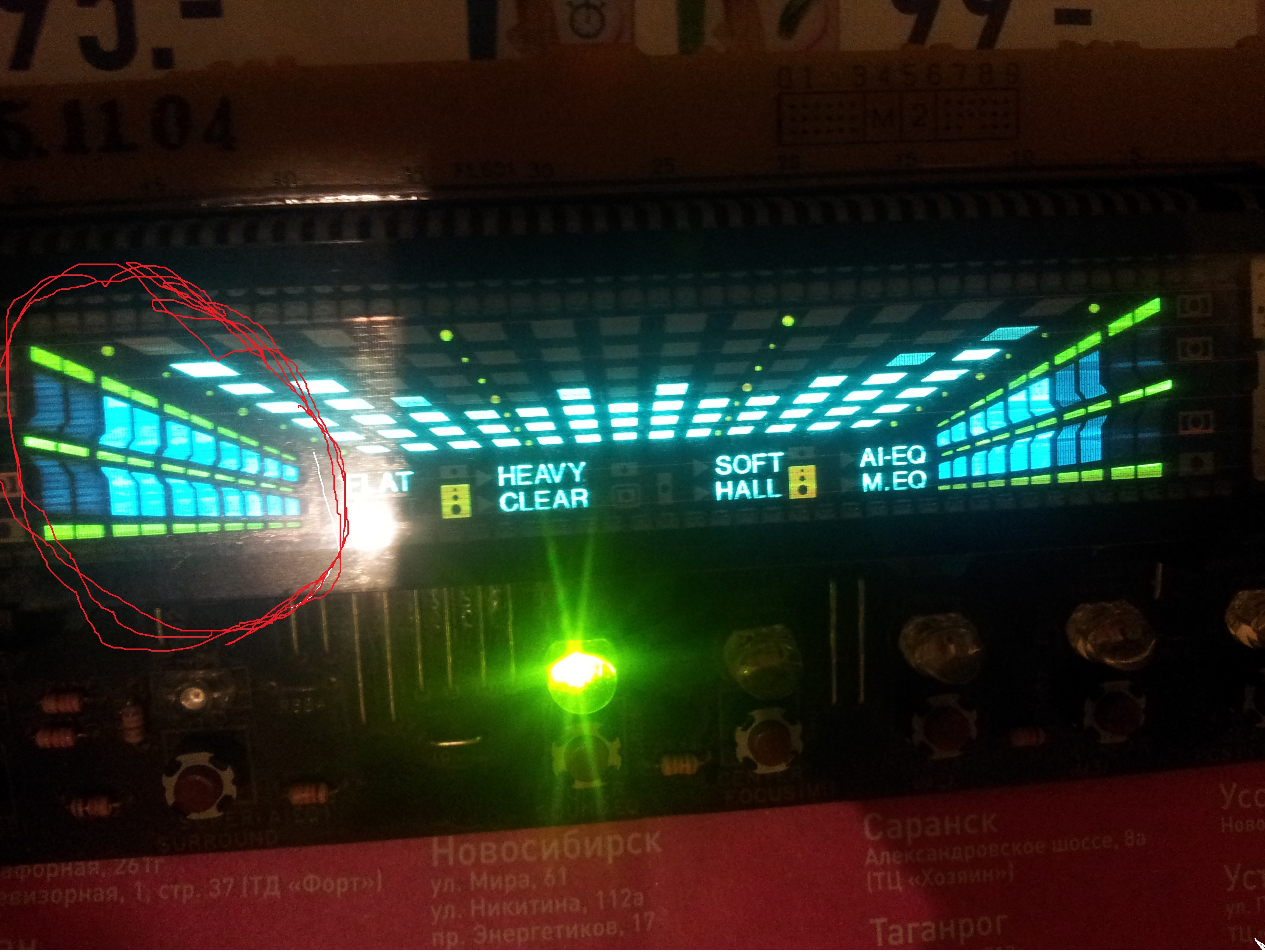 Здравствуйте. Прошу помочь в ремонте муз. центра Technics 290. В левом канале появился слабый хрип и на дисплее эквалайзера в левой части экрана появилась "рябь" отмечена на фото. Проверил конденсаторы прибором ESR все в норме ,выпаял микросхему УНЧ RSN 311 включил на дисплее "рябь" не зависимо от сигнала. Схему нашел только на усилитель, на эквалайзер нет.