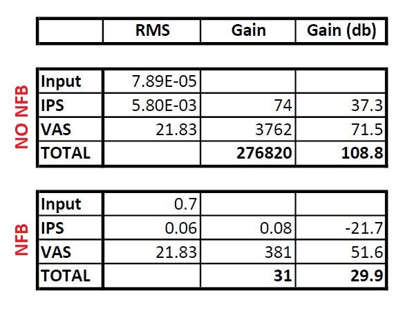 В таблице - действующие значения сигнала при разомкнутой цепи ОООС (вверху) и при замкнутой (внизу) на частоте 1 КГц.