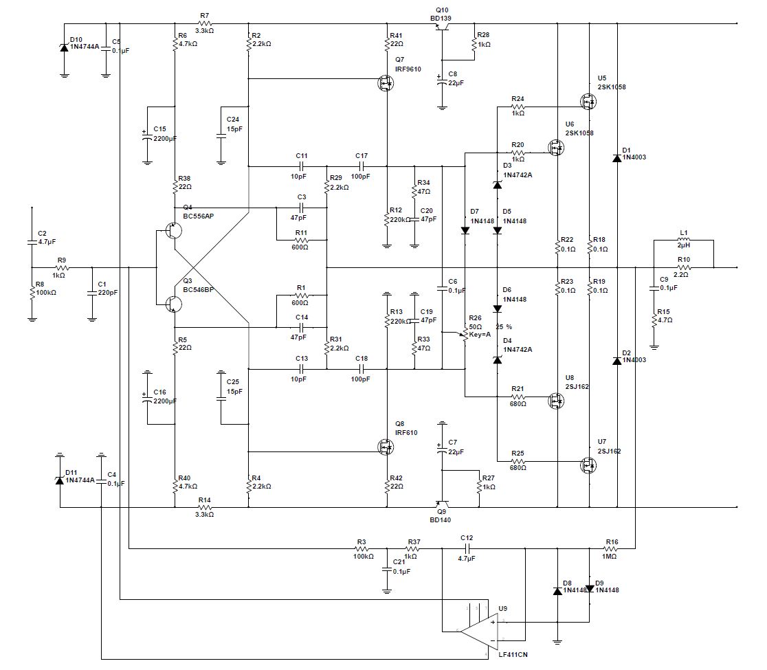 Отдельная тема - глубина общей ООС. Тут мнений тоже немало. От полного её отсутствия (ОООС это зло), до "нечеловеческой" глубины (типа, глубокая ОООС все исправит). Мой подход заключается в том, чтобы сделать каждый каскад максимально линейным при разомкнутой петле обратной связи (в том числе при помощи местных ООС), а затем уже добавить общую петлю глубиной 35-50дб при "стандартном" коэффициенте усиления УМ, равном 29дб.