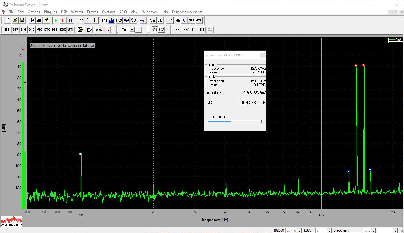 Измерил спектры при выходной мощности 10 Вт (9 вольт RMS на 8 ом) и 45 Вт (19 вольт RMS на 8 ом). Соответственно, посчитаны THD на 1, 10 и 20 КГц и IMD при 2-х компонентном входном сигнале 14 + 15 КГц.