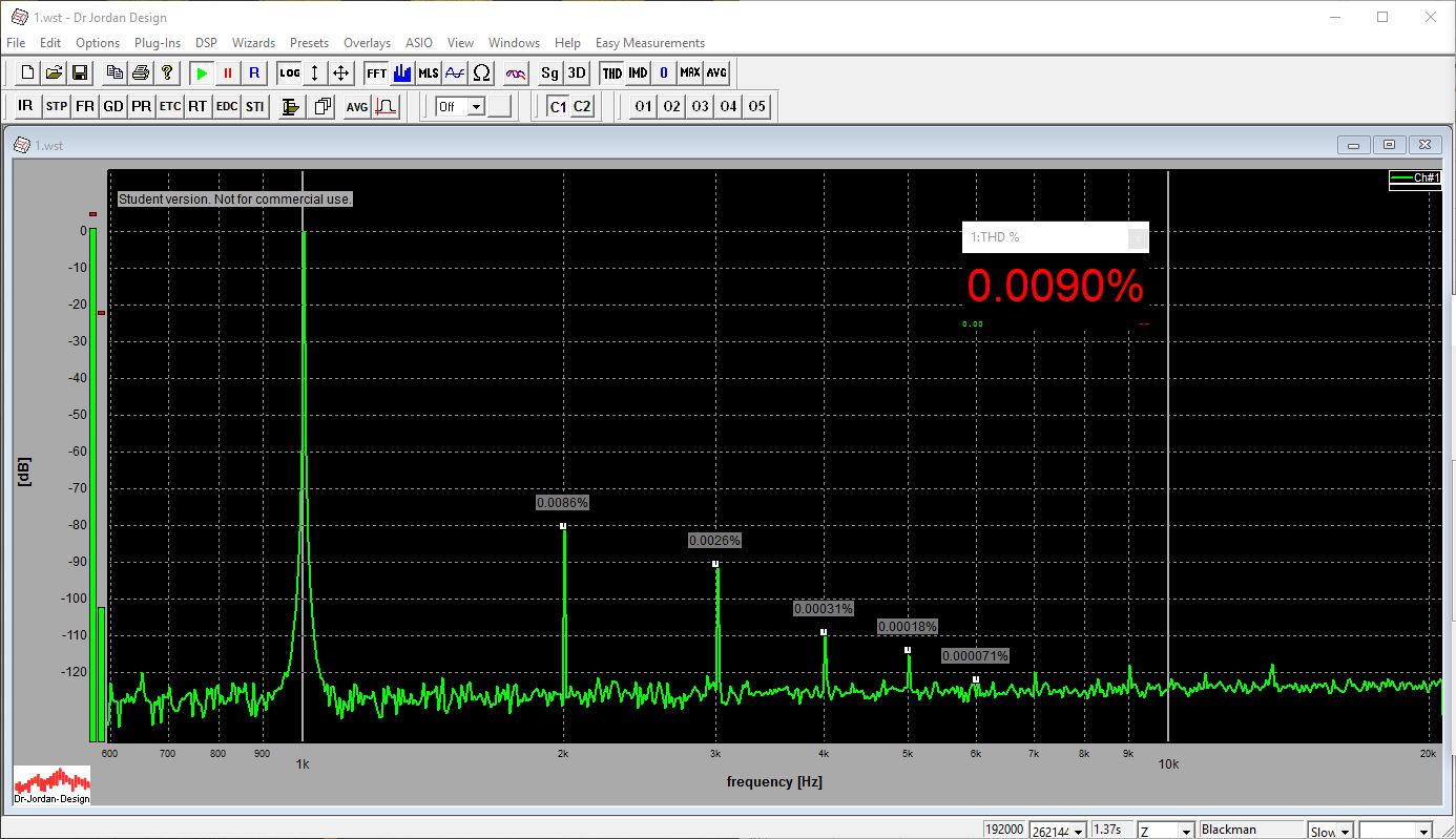 - Низкий уровень гармонических искажений. Порядка минус 90-100дб. Правильный "профиль" гармоник - как правило, доминировать должна 2-я гармоника, 3-я ниже, 4-я еще ниже. Гармоники более высокого порядка должны быть уже где-то на уровне шума. Тут кое-кто может со мной не согласиться. Существует мнение, что присутствие 2-й гармоники на уровне порядка -50дб добавляет звучанию "музыкальности" и "вовлеченности". Тем не менее, лично я - за точность воспроизведения.