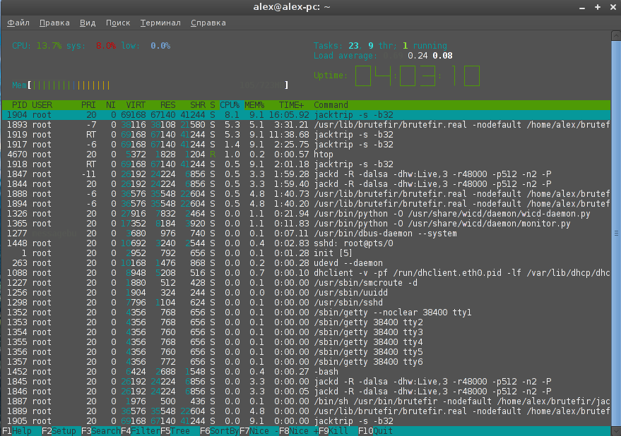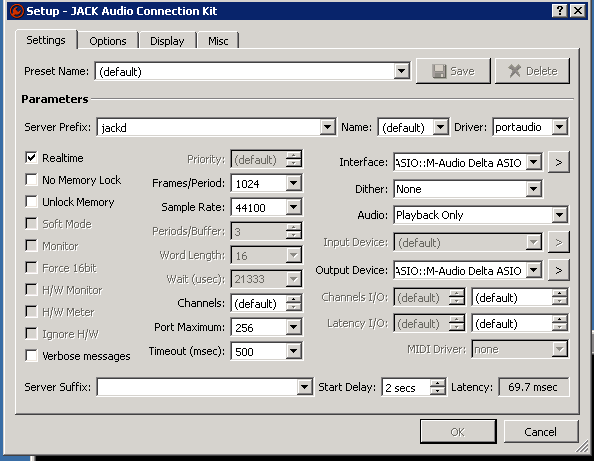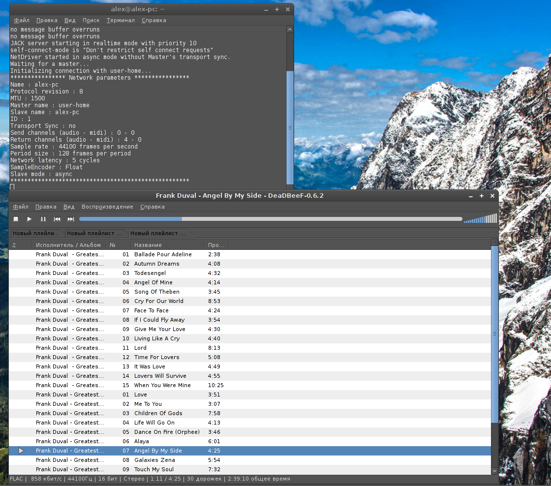 Все сервер NetJack2 запущен, теперь с любой машины с установленным Jack подключаемся к серверу