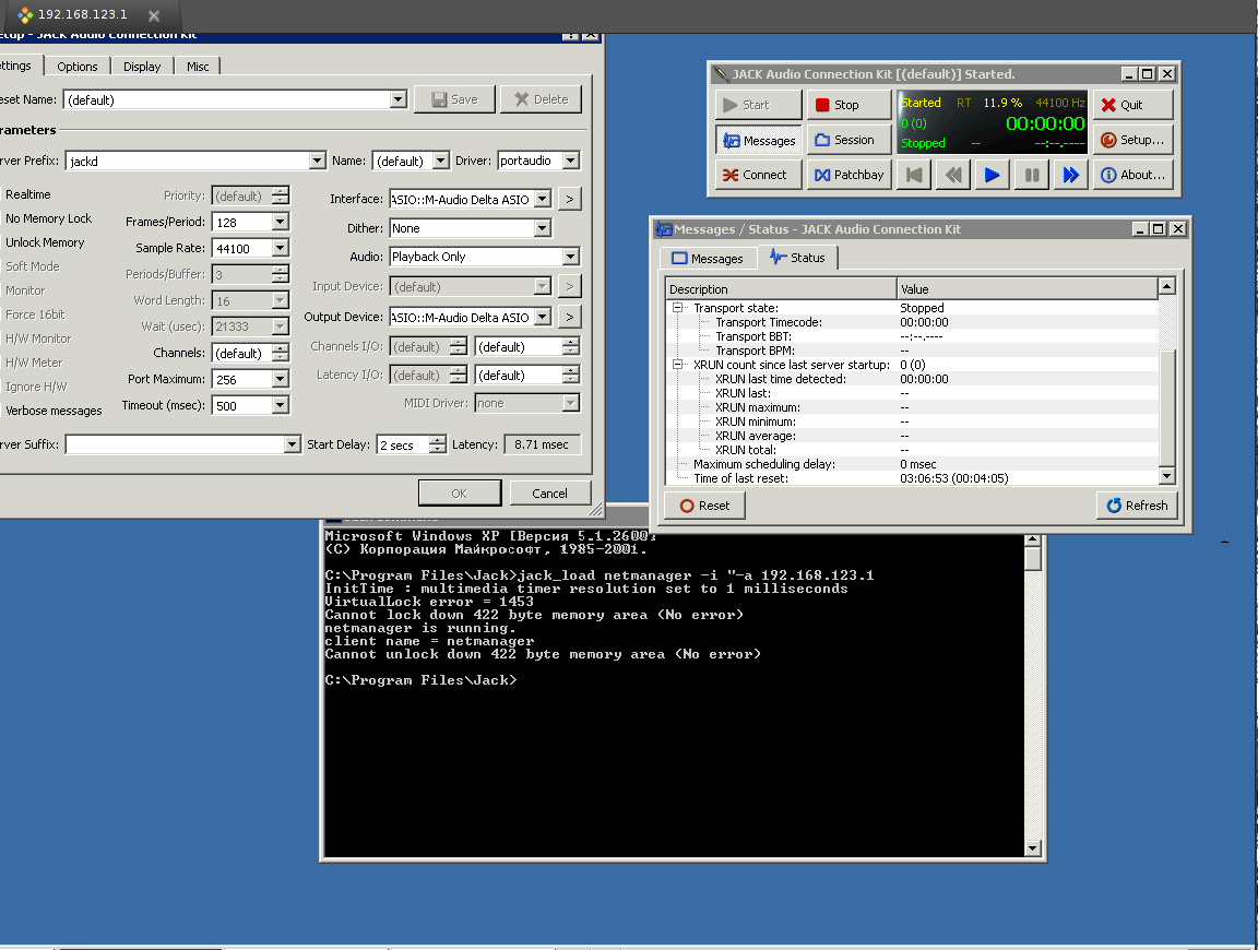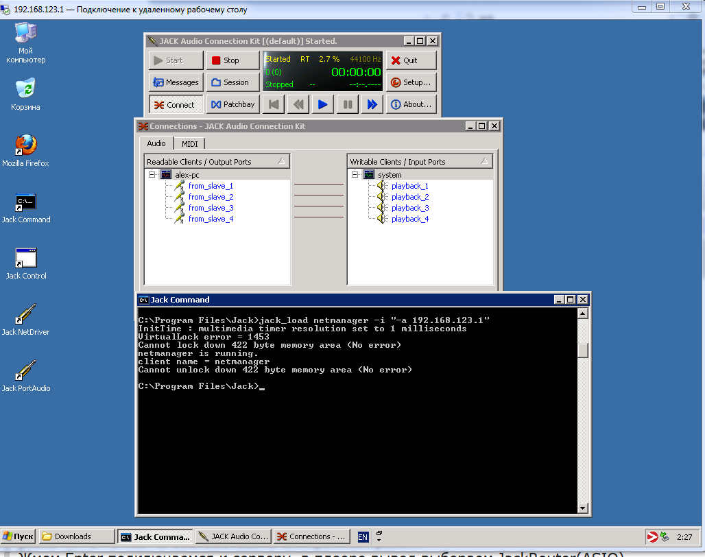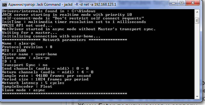 jackd -R -S -d net -a 192.168.123.1 синхронный режим
