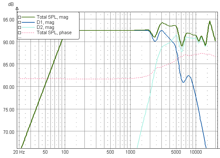 подъем берется, как видно по графику, потому что в общую зону включается подъем у ширика, что по -3дБ складывает ниже общую работу на стыке разделов. но учитывая ДН для слухового восприятия диффузного поля - этого подъема, в теории, на слух быть не должно. Как будет в реальности - не ясно - т.к. нужно иметь реальные замеры осевых и угловых АЧХ, а также фазы, которая, судя по импедансу ширика (и ширик ли он с таким подъемом? скорей всего это басовик с привернутым визером, и не более), крутится очень прилично в полосе раздела.