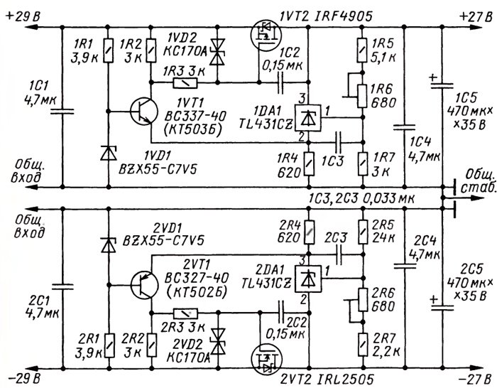 Такие параметры стабилизатора обеспечивают применённые в нём мощные полевые транзисторы - IRF4905 (р-канальный) с максимальным током стока 74 А и сопротивлением открытого канала в 0,02 Ом и IRL2505 (п-канальный), с соответствующими током 104 А и сопротивлением 0,008 Ом.