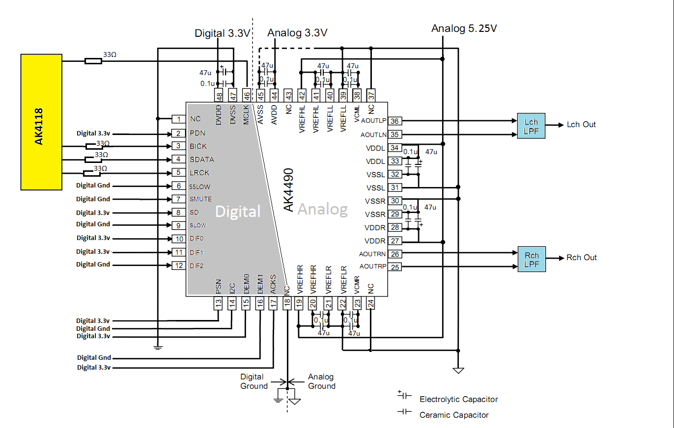 Схема подключения ак4490 аналогична этой https://forum.vegalab.ru/attachment....2&d=1463941987 Отличие состоит в том, что нет микросхемы ак4118, т.е. входы свободны для подключения по i2s, и другие номиналы электролитов, вместо 47мкф стоят по 10мкф)