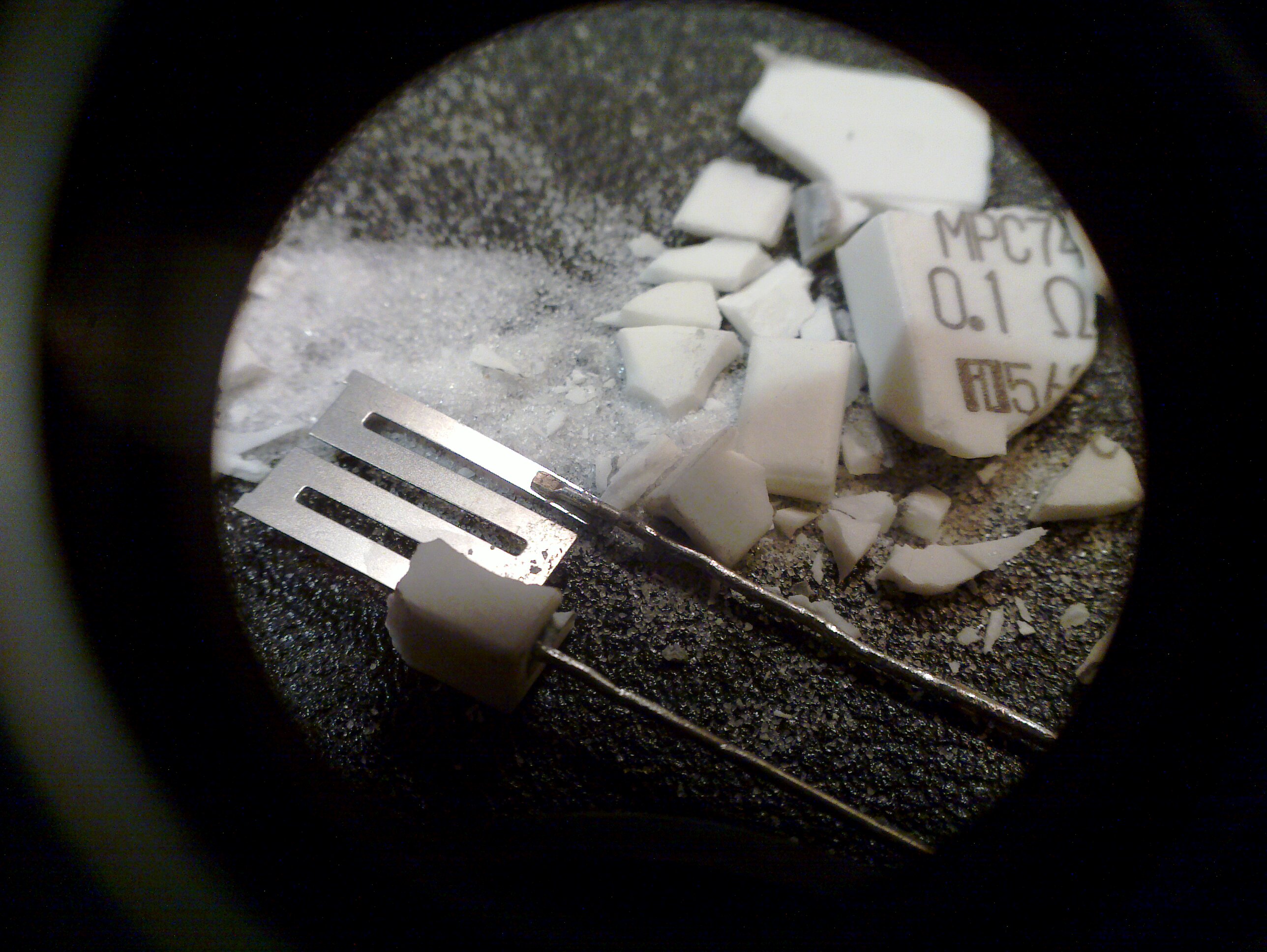 Эти резисторы представляют из себя брусок сплава, с сопротивлением 0,1 Ом. Есть и другие номиналы.