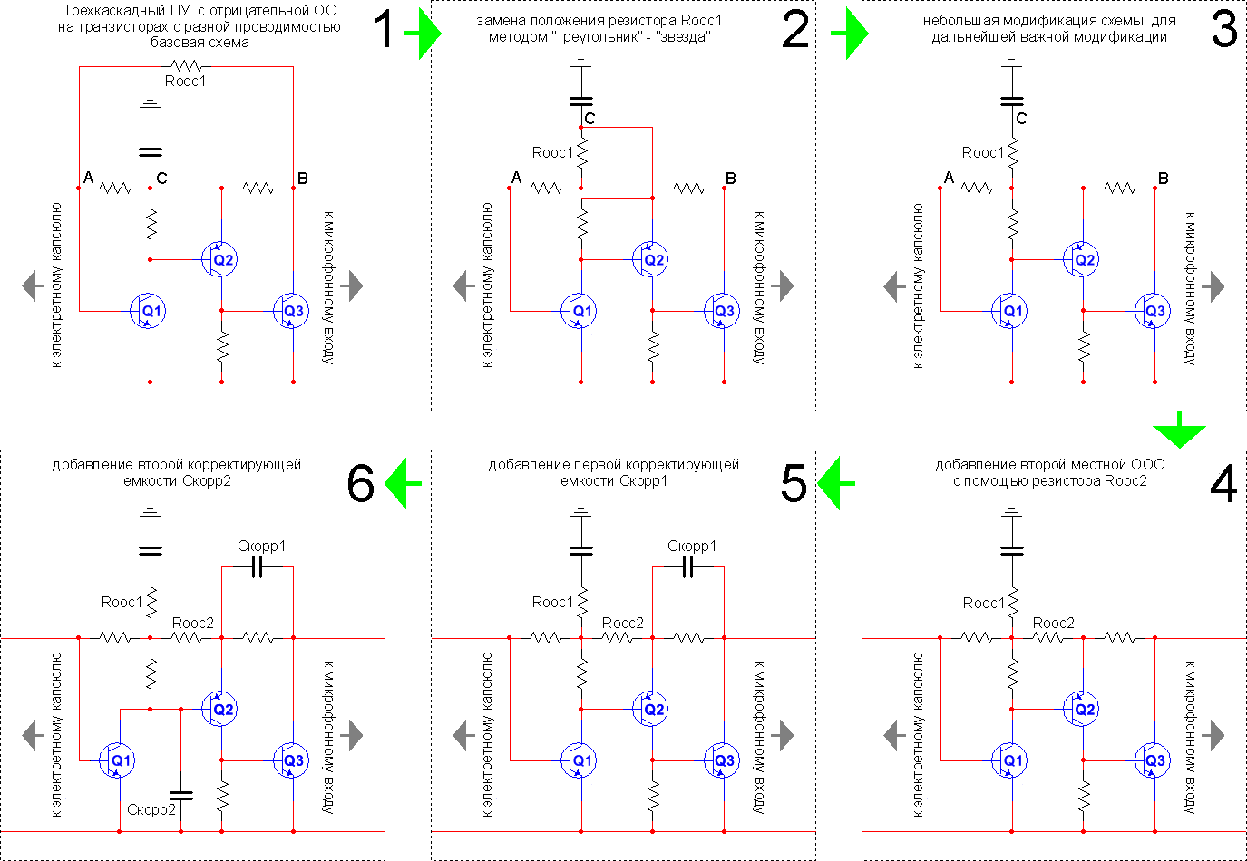 Ну, теперь можно приступить к делу. Существует много хороших схем ПУ, решающих задачу улучшения качества записи с дешевого электретного микрофона. Но они, как правило, используют дополнительный собственный источник питания (внешний или встроенная батарейка) и выполнены в виде отдельного блока межу микрофоном и гаджетом с трехпроводным подсоединением микрофона. Здесь же ставится другая задача – сделать предусилитель, встраиваемый в микрофон так, чтобы последний по-прежнему присоединялся к микрофонному входу стандартным способом (штекером по двухпроводной линии) и питался от него. И чтобы он сохранял высокие характеристики при работе от низковольтного фантомного питания современных гаджетов… При этих требованиях круг уже известных схем, претендующих на решение поставленной задачи, сужается до трех…четырех базовых вариантов.