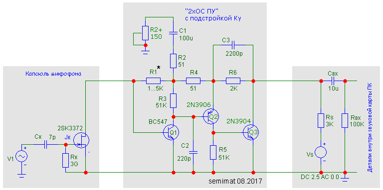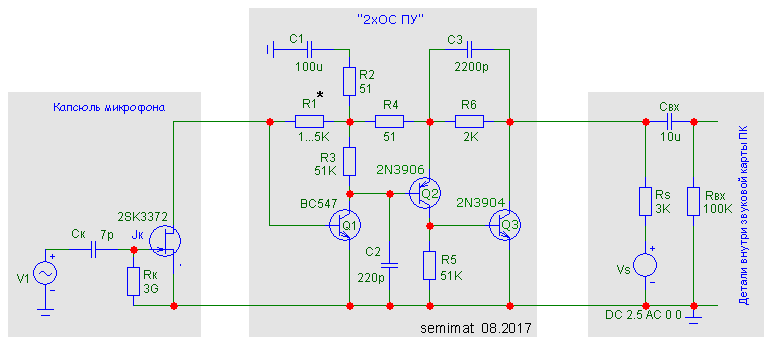 Когда-то и я собирал что-то похожее. До сих пор валяется микрофон в котором установлен капсуль МК-3 с подобной двух транзисторной схемой. Но сейчас помоему проще и качественнее использовать микросхемы типа MAX9812 https://datasheets.maximintegrated.c...2-MAX9813L.pdf. Причём почти задаром можно у китайцев купить готовый модуль