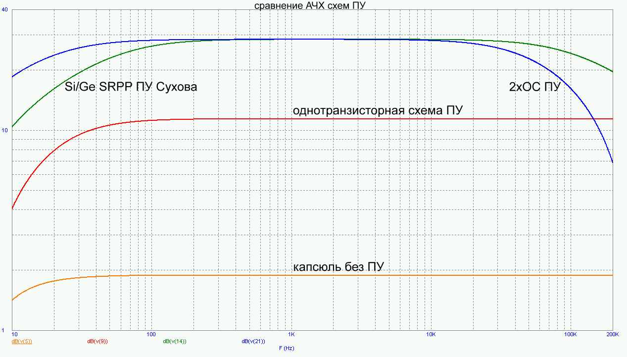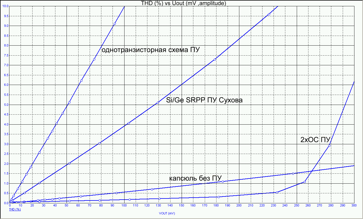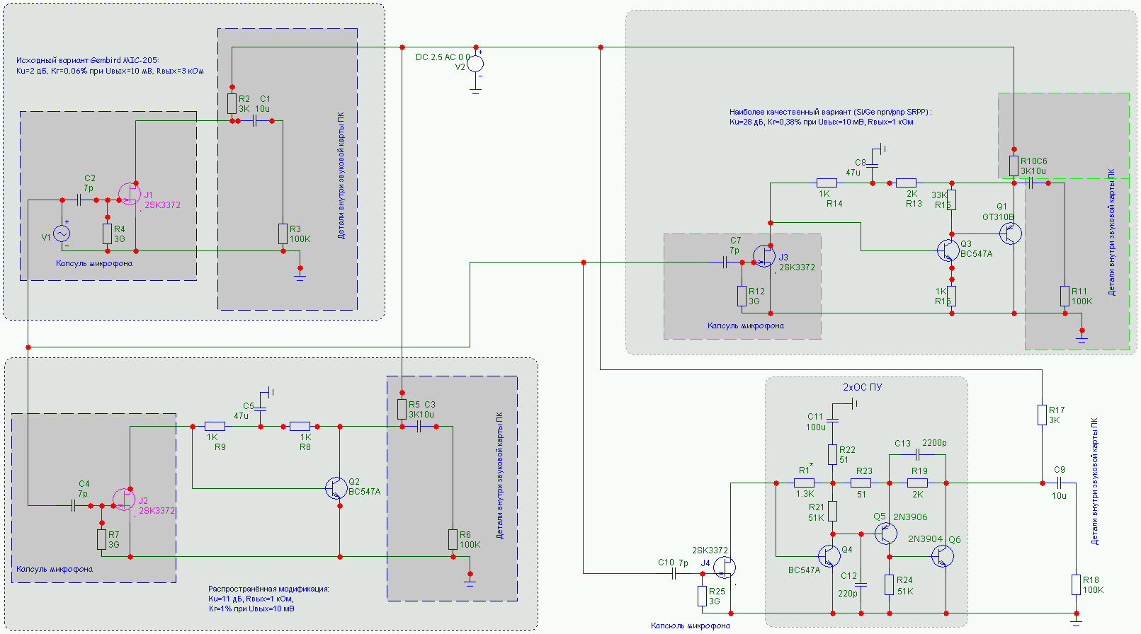 Замечу, что однотранзисторная схема, несмотря на простоту, дает достаточно хорошие результаты при пятивольтовом фантомном питании. Но при снижении питания до 2.5 В схема резко ухудшает свои характеристики, что и будет видно в дальнейших сравнениях.