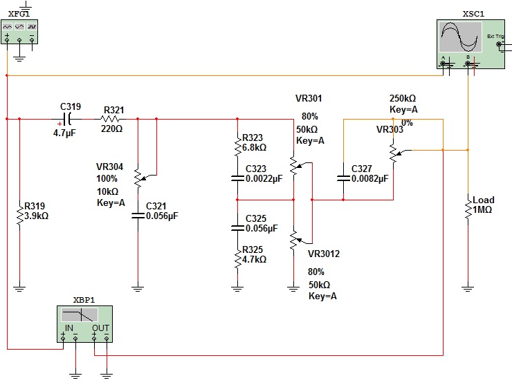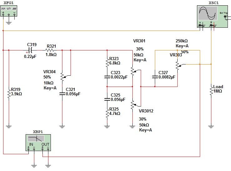 Чтобы наметить пути решения проблемы, забил схему регуляторов в Мультисим, но потенциометры в схеме хитрые, таких в Мультисиме-11 нет. Попытался изобразить РГ по другому, а баланс просто выкинул. Не знаю, насколько данная модель отражает реальность, но АЧХ как-то регулируется![]()