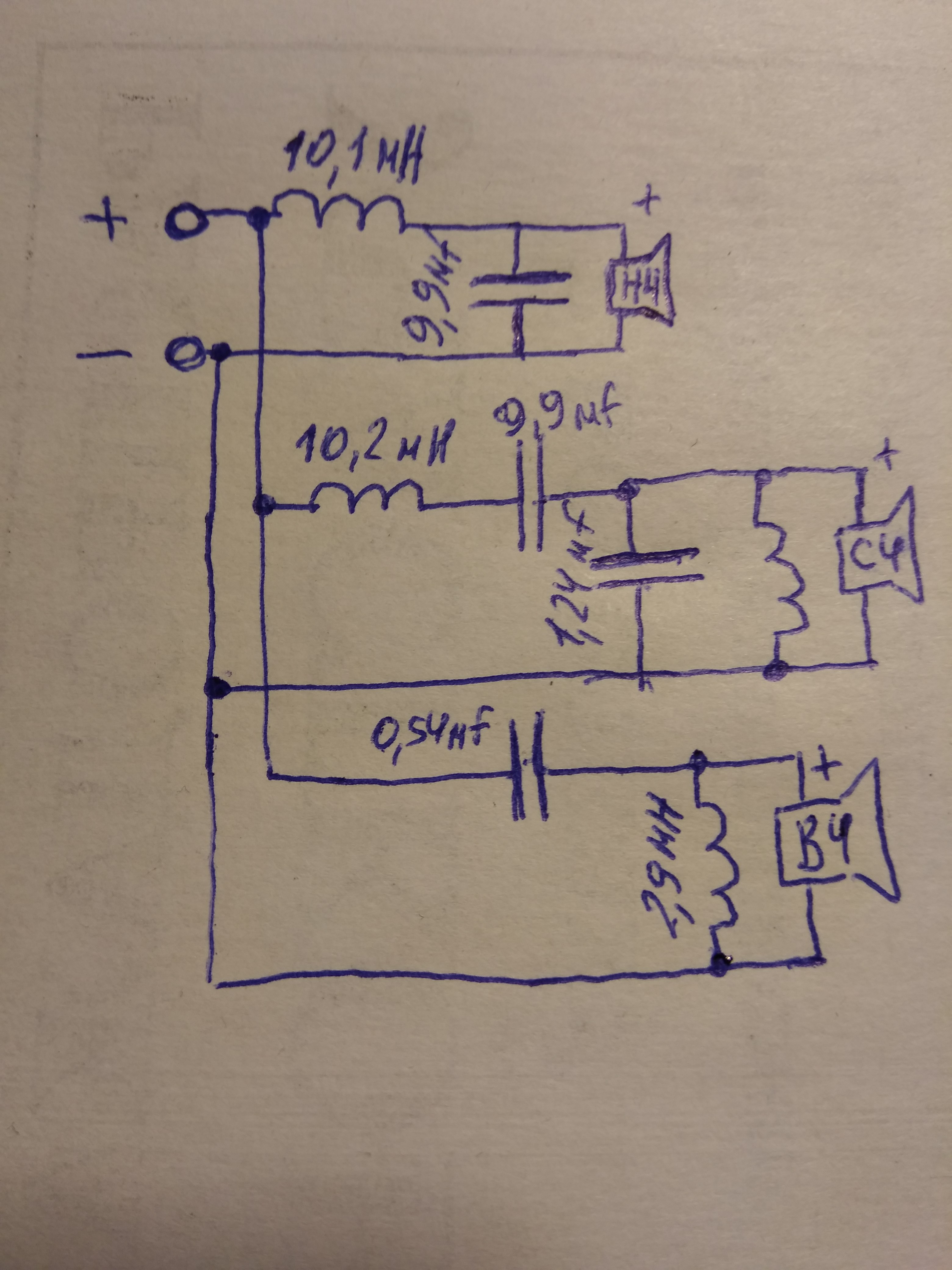 2. фильтр нарисован в корне неверно. СЧ/ВЧ/НЧ должны параллельно цепляться к входным клеммам, а не гроздью один за другим, как у вас.