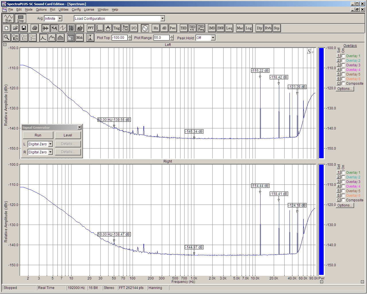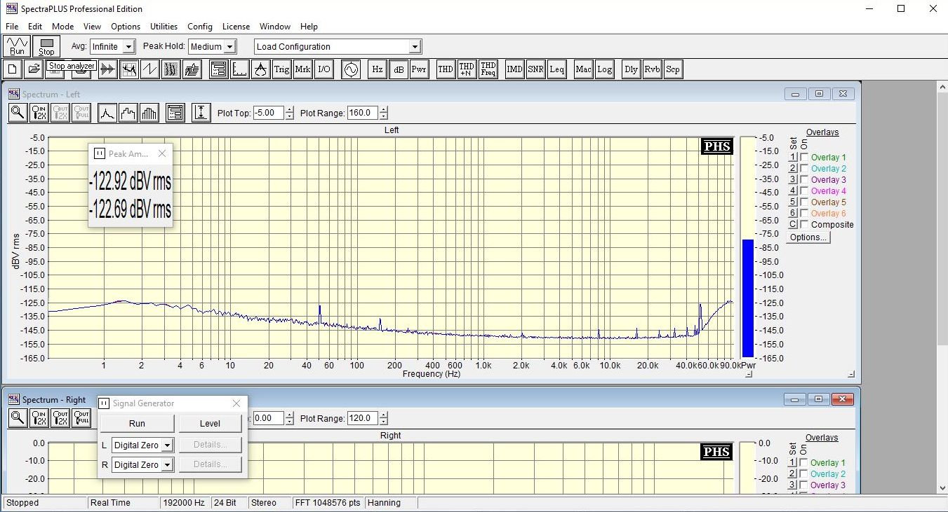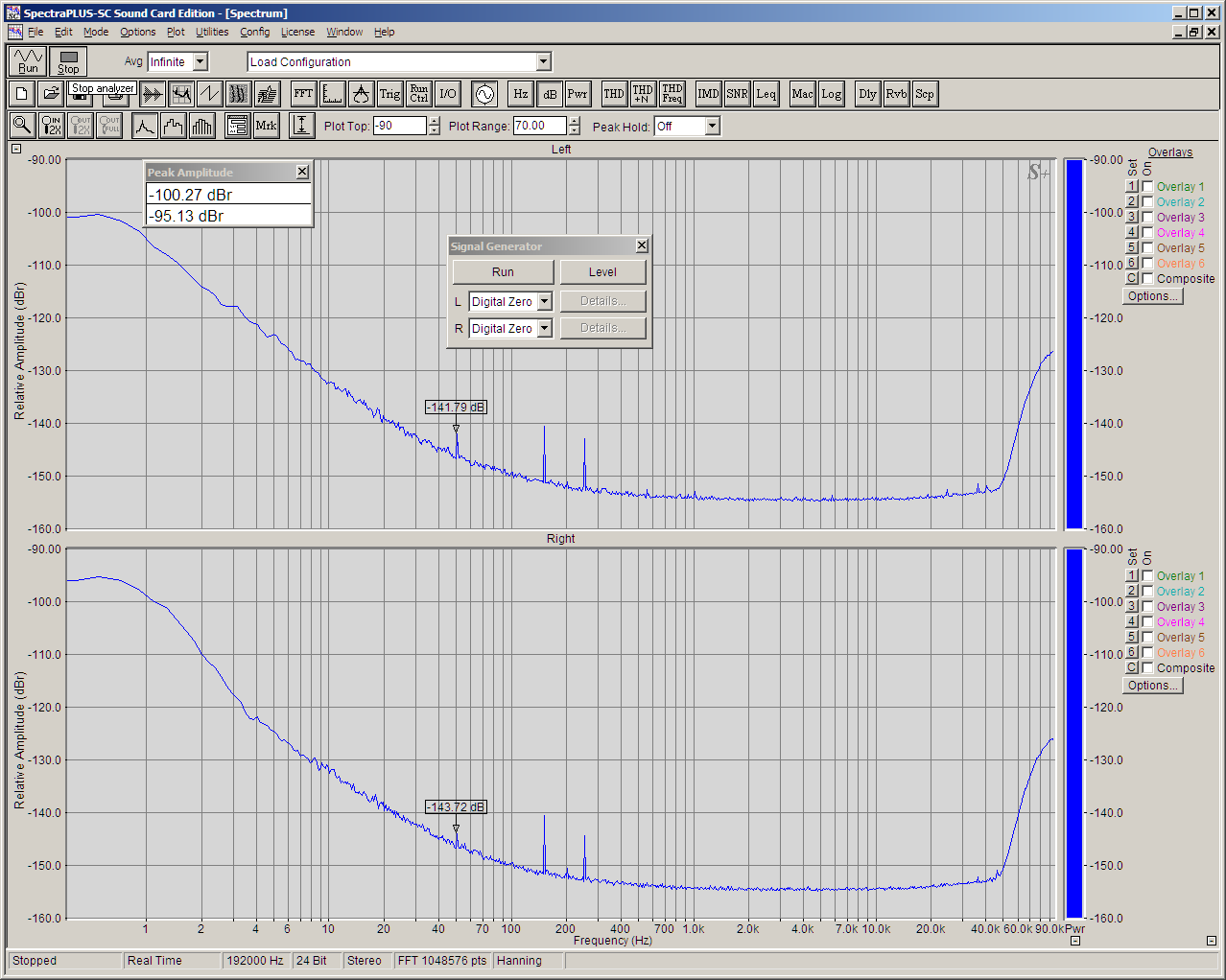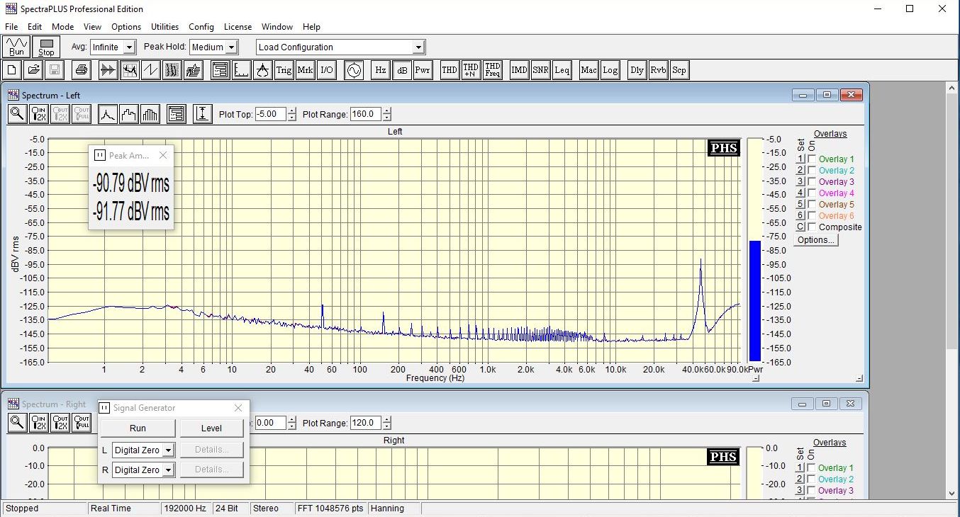 Это асио 24 бита 192 кГц уровни входа (лин) и выхода (наушники) 0 дБ. Торчат палки на 12000, 24000, 36000 Гц и далее. При семплрейте 96 кГц - чисто.