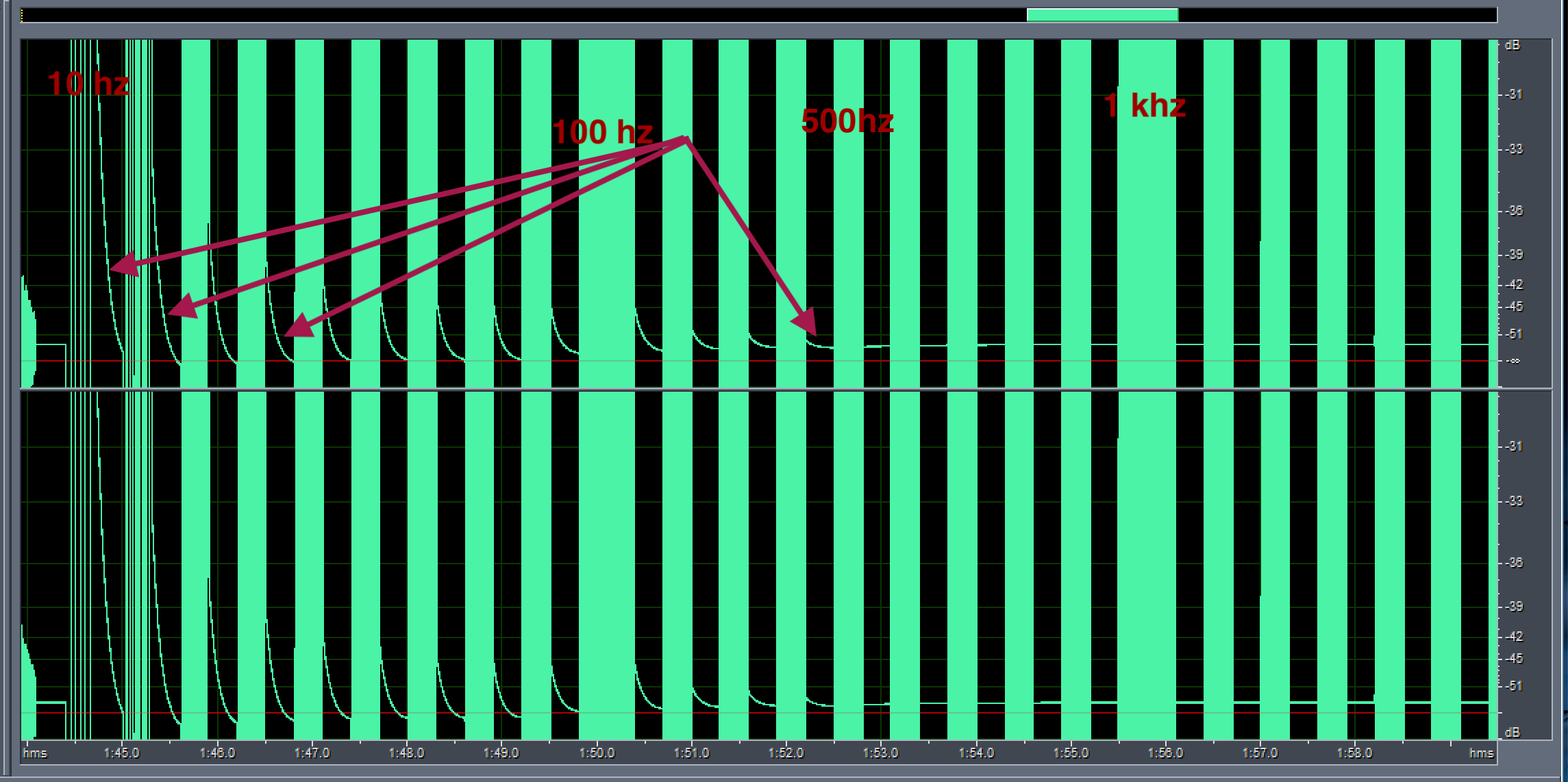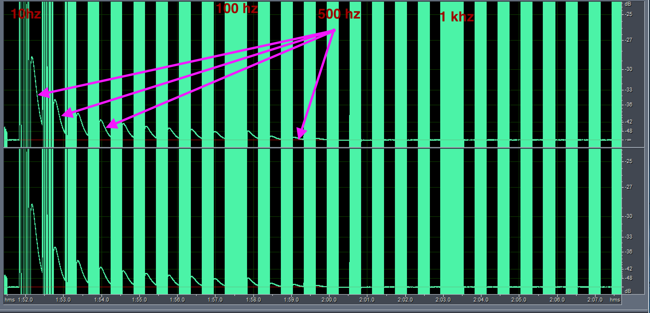 На карту подаются тестовые сигналы частотой 10-20-30---100-200-300---1000-2000 гц ... и так далее