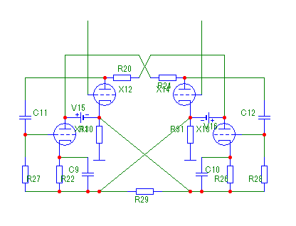 R30 R31 образуют заземленную среднюю точку нагрузки. Входной сигнал подается на сетки верхних ламп, противофазно, симметрично отн земли