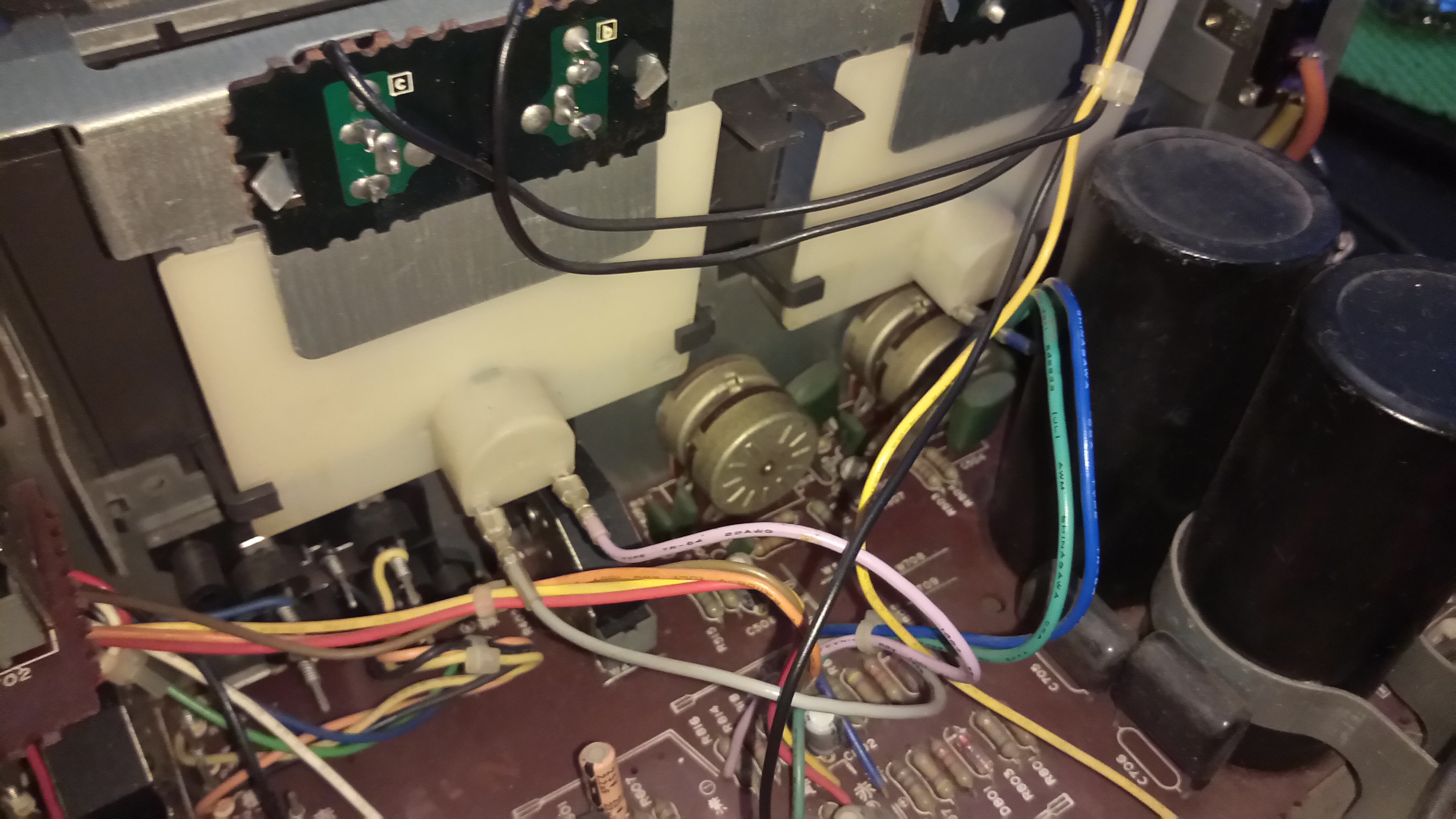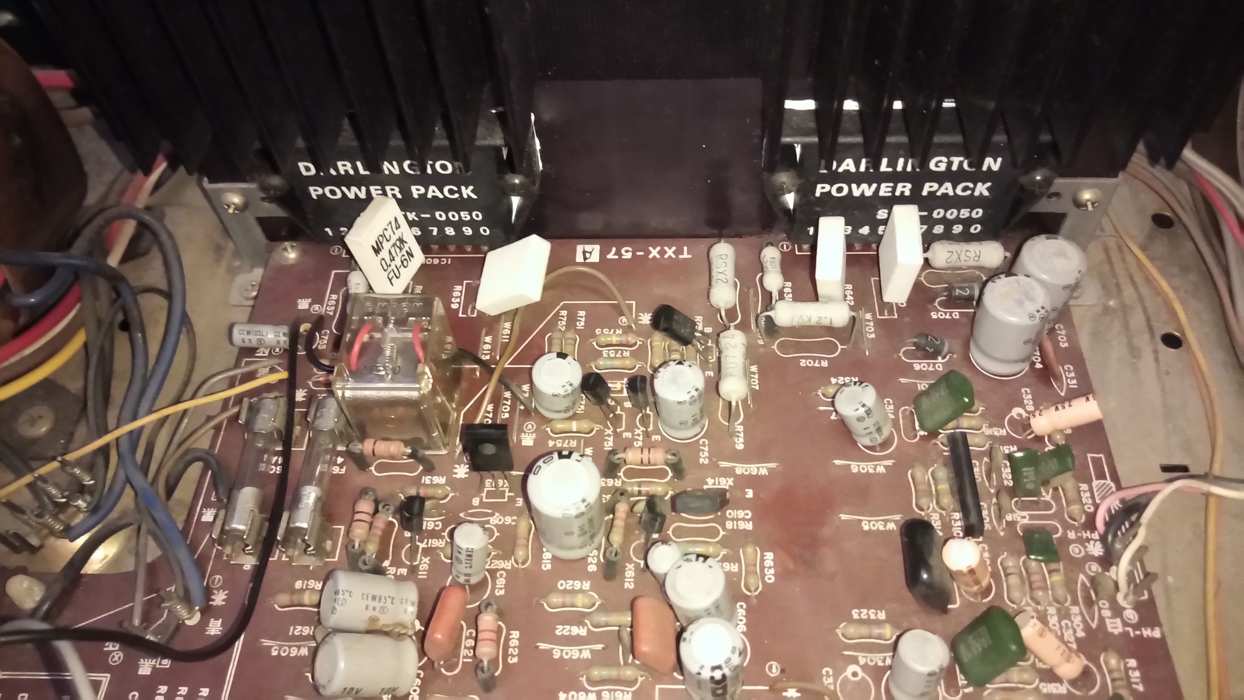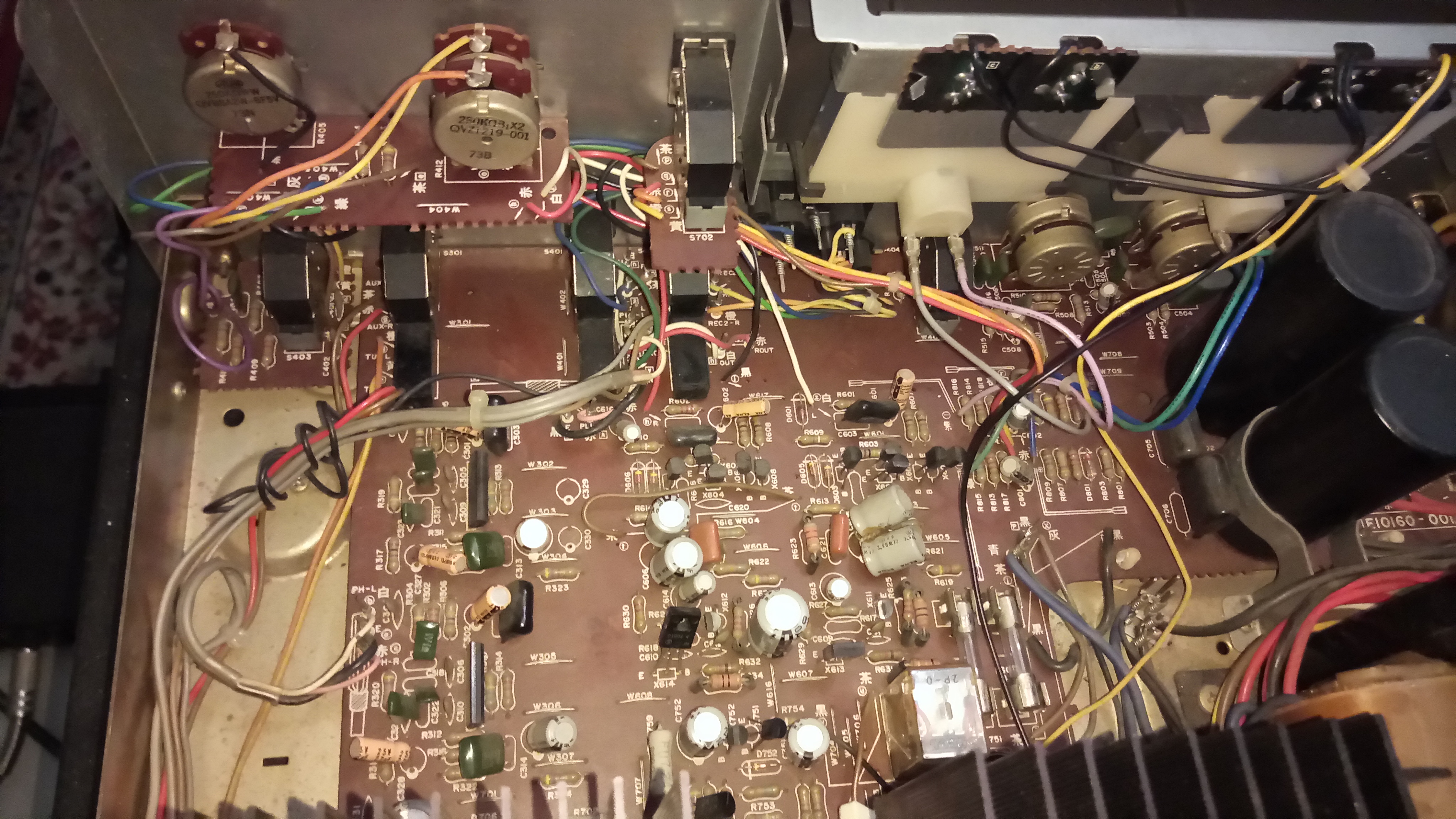 Всем доброго времени суток. Имею винтажный японский усилитель Vitcor JA-S35 1978 года и недавно столкнулся с такой проблемой, что стрелочные индикаторы показывают разные значения при подаче тестовых сигналов на вход AUX что на 1 KHz, что и на 100 Hz. Правый канал немного заваливает на несколько Дб по уровням. Потенциометр в норме, хоть и не много по потрескивает на некоторых проходах графитовые дорожки на уровне 5 из 10, но некоторых уровнях всё одинаково. Думаю что ручка баланса, "вроде бы". Стоит на 0. Решил сделать замер сигналов на выходе из разъёма PHONES, ибо грешу на выходной каскад либо предусилитель. Но подал тестовый сигнал 1 KHZ - поставил выходной сигнал с разъёма усилителя на тестовую звуковую карту. При записи уровни в норме. В чём может различаться разница стерлочных индикаторов при подаче моно сигнала (генератора на предусилитель). Реле защиты пробовал почистить, нагрузку держит, нагара нет но греется. Звуковая карта профессиональная стоит. Фото прилагаю. А также фото того места платы от куда питаются стрелочные индикаторы.Там стоят 2 конденсатора 10v 47 mKf. Что можете посоветовать в данном случае? Какая калибровка необходима?
