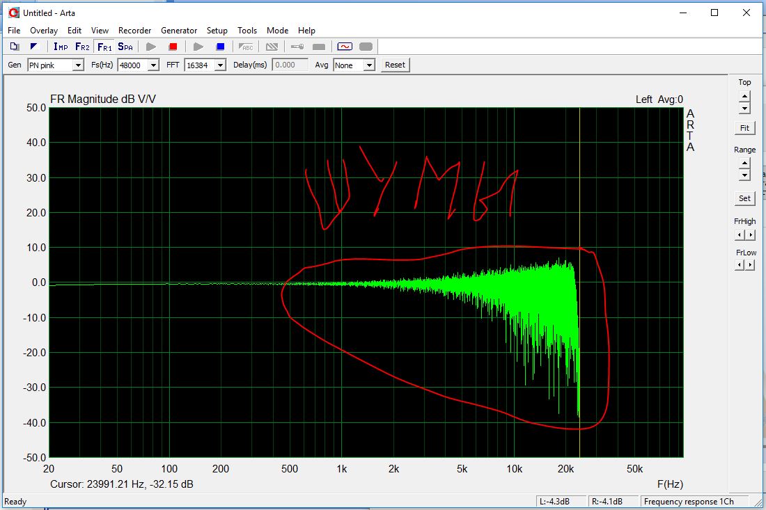 Всё играет хорошо, полез замерять и получилась вот такая картинка в программе Untited Arta (средняя картинка), замерил цап установленный в ноутбуке там всё чисто (первая картинка). Подскажите пожалуйста куда копать, от чего это может быть?