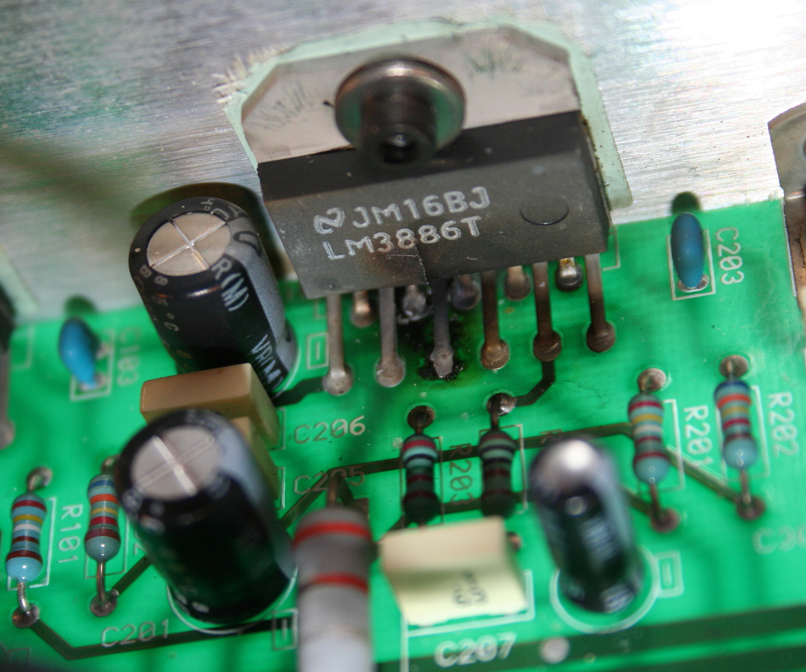 Осмотр показал, что головки в порядке, а вот на плате имеется одна сгоревшая LM3886T (на НЧ у них стоит пара микросхем) и вздутый кондёр рядом с ней.